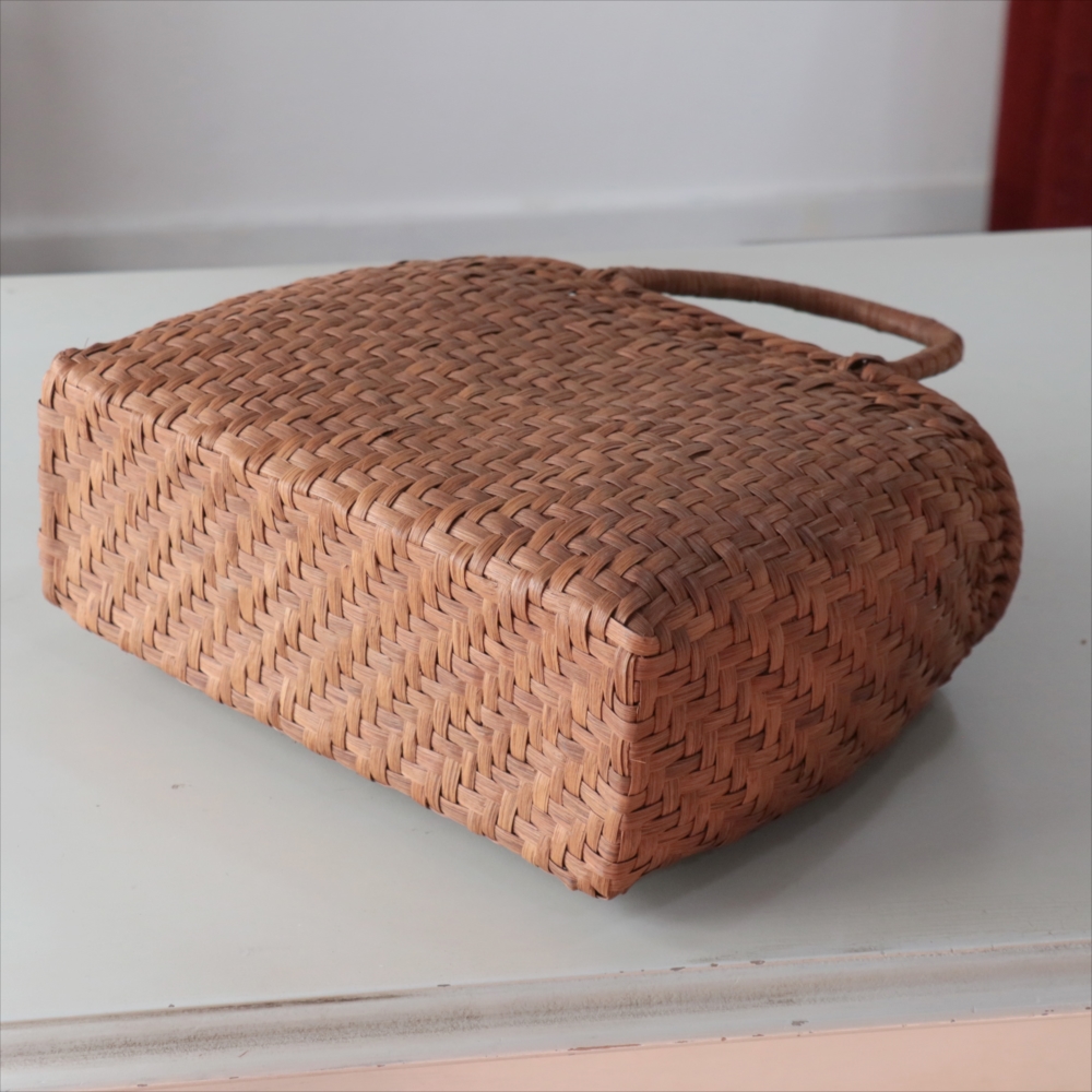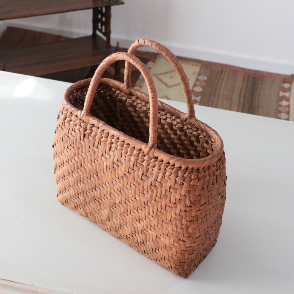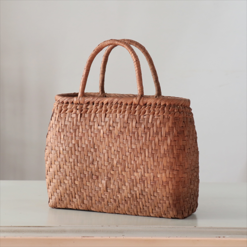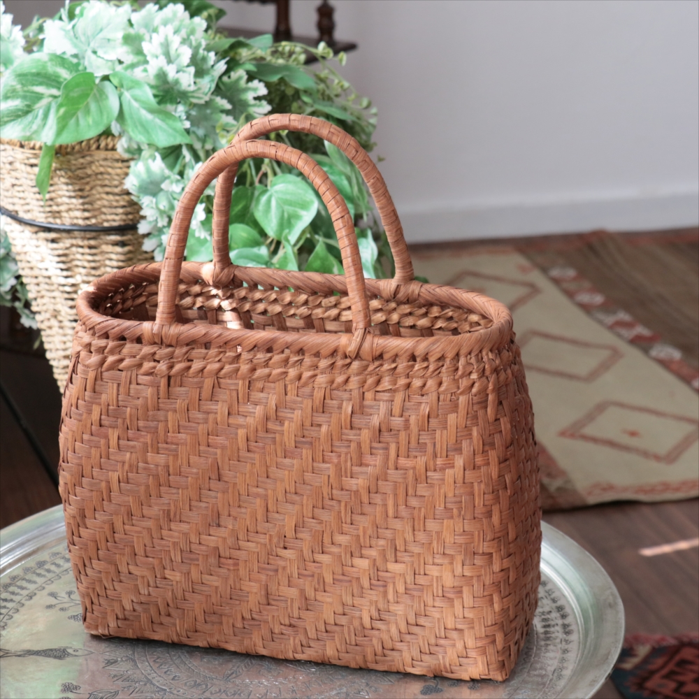 まるみのあるきれいなラインのカゴバッグ。シンプルな網代編みです。高さがあってマチも広めなので、普段使いに活躍できるかごバッグです。やまぶどうの蔓の表面を削って整え、滑らかに仕上げています。山ぶどうのかごバックは、最初は少し赤みのある明るい茶色で、使い込むほどに艶が出てこげ茶色の味わい深い質感に変わってゆきます。その変化もお楽しみください。