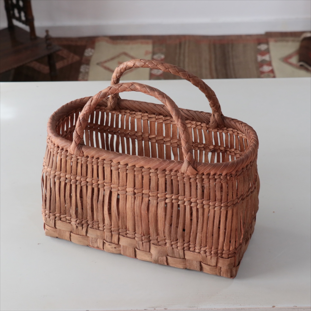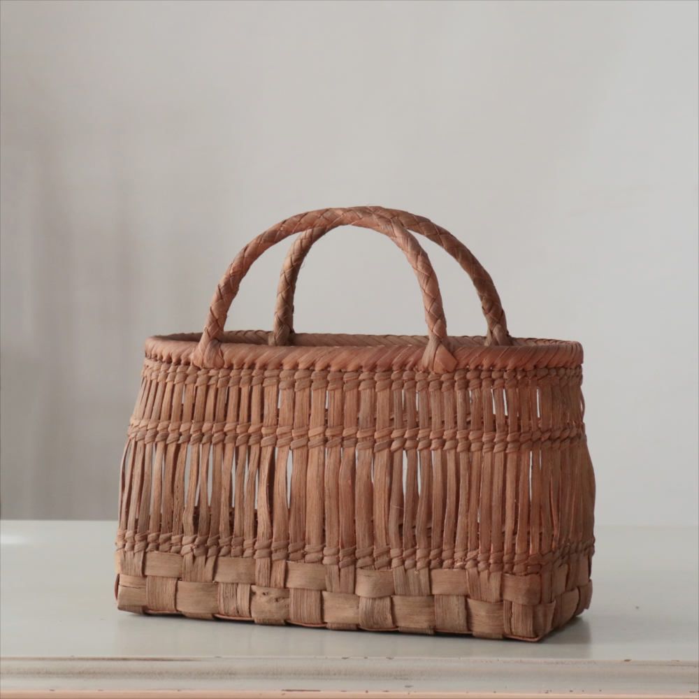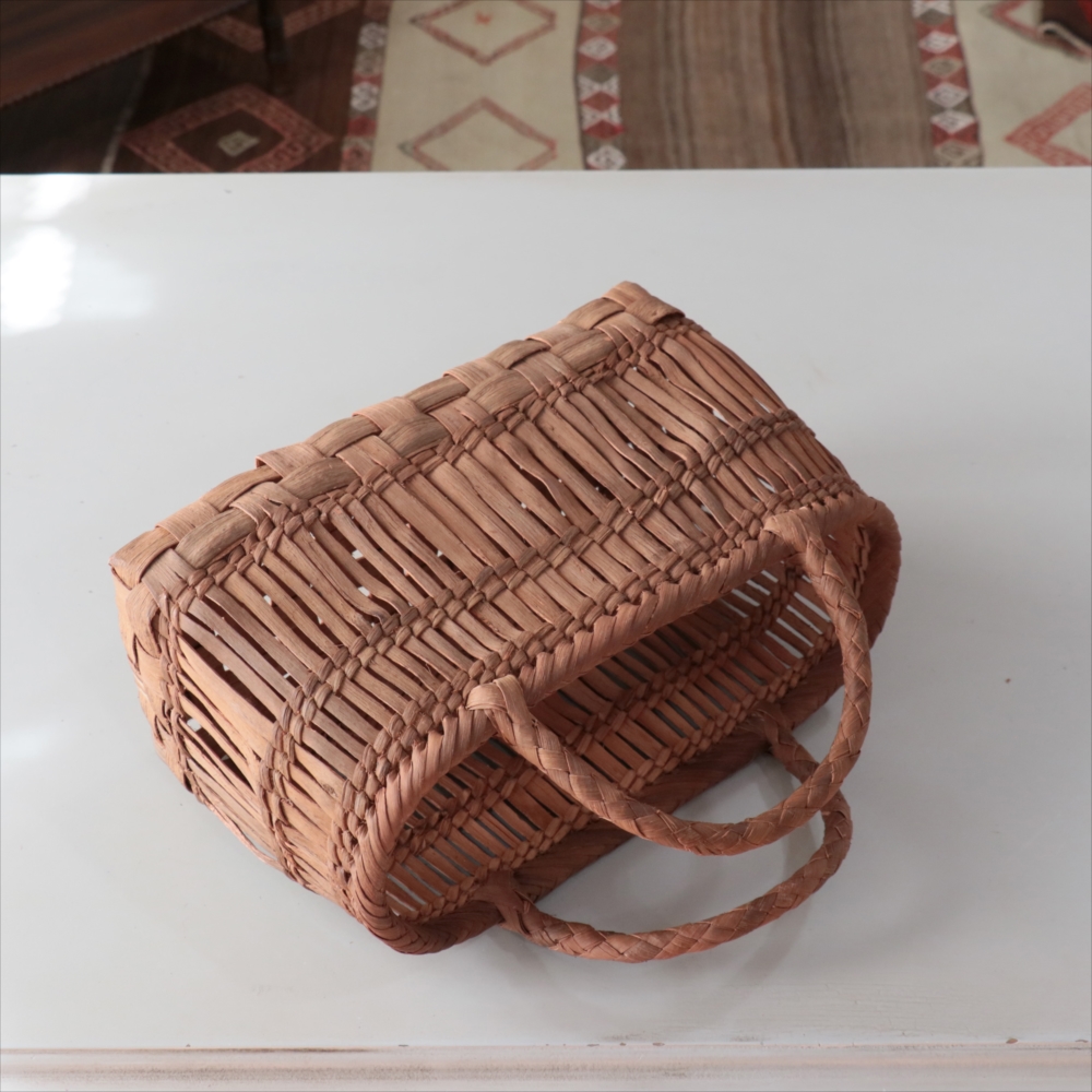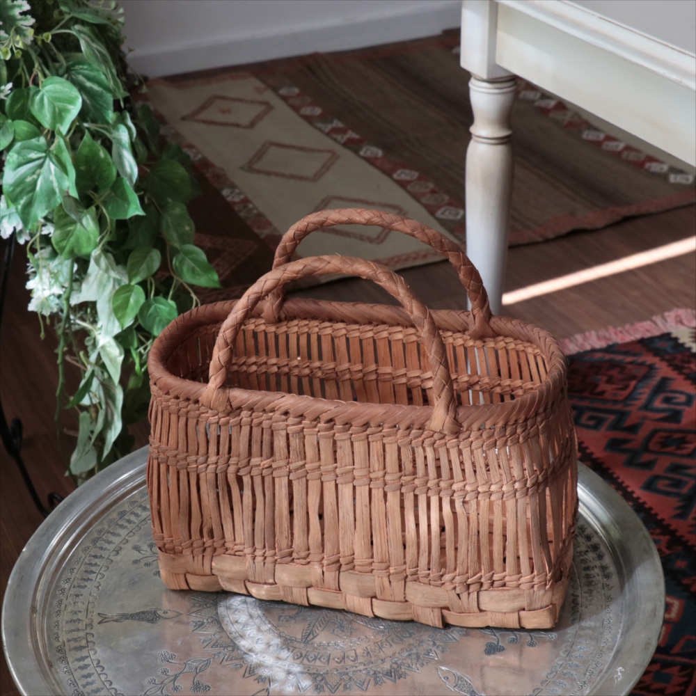 山葡萄の蔓の素材感が、存分に楽しめる透かし棚編みのかごバッグです。やまぶどうの蔓がちょっと曲がっているところや、節など、表情のゆたかな仕上がりです。