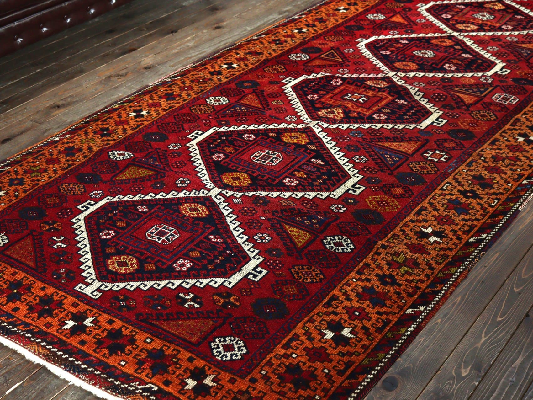 色鮮やかなレッドとオレンジのコンビ-ネーションが印象的な縦長サイズの絨毯。6つのメダリオンは白糸で縁取られアクセントになっています。額縁のデザインも多彩な色使いで細かく表現されていて、サイズのみならず存在感のある1枚。デザインや織りの特徴はクルドに近いので、ジハンベイに移り住んだクルド族の手による織りと推測できます。