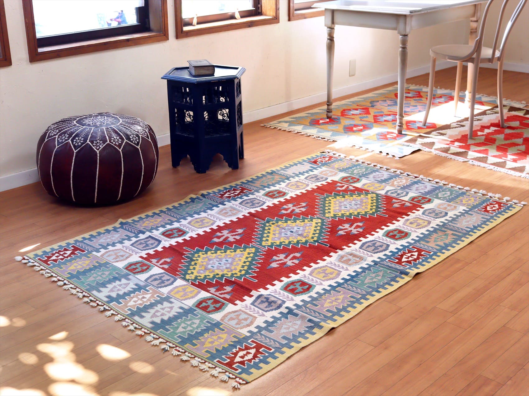 トルコキリムらしい伝統的なスタイルで織られているカイセリ産のキリムです。カイセリ地方は、トルコの中央部、カッパドキアに近く、古い時代から多くの諸品が集まり、現在でも絨毯やキリム産業の中心となっています。工業製品にはないあたたかさがあり、我が家のキリムとして愛着の持てる一枚になってくれます。