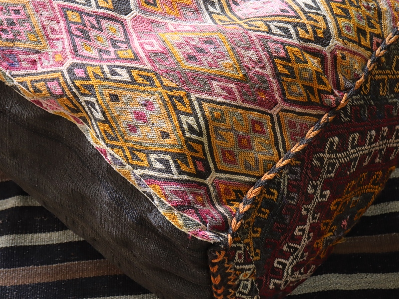 ほぼオリジナルの状態で、キリムの織りにはダメージはありません。口の部分などは多少の擦り切れなどがあります。厚みのあるジジム織り。