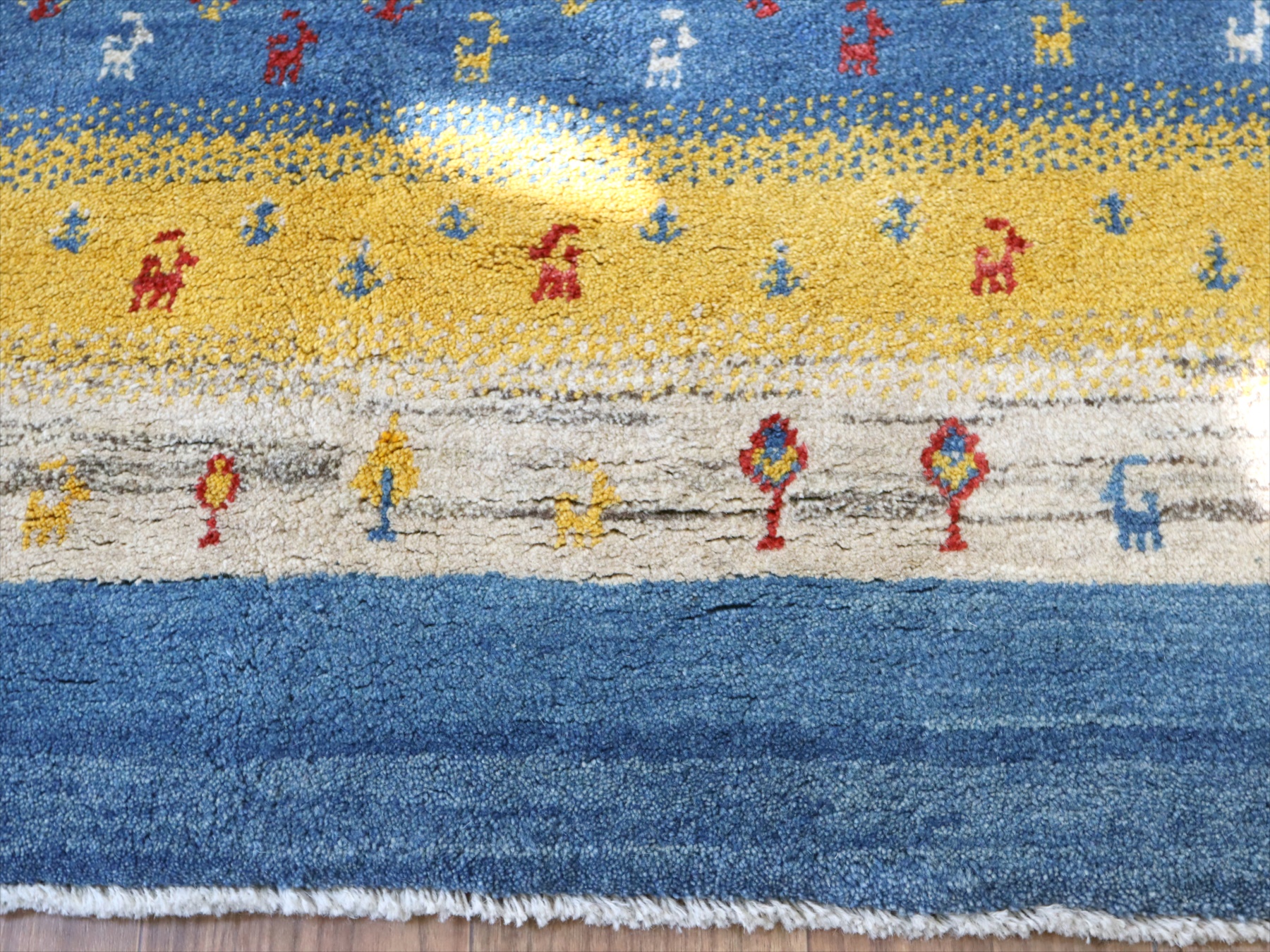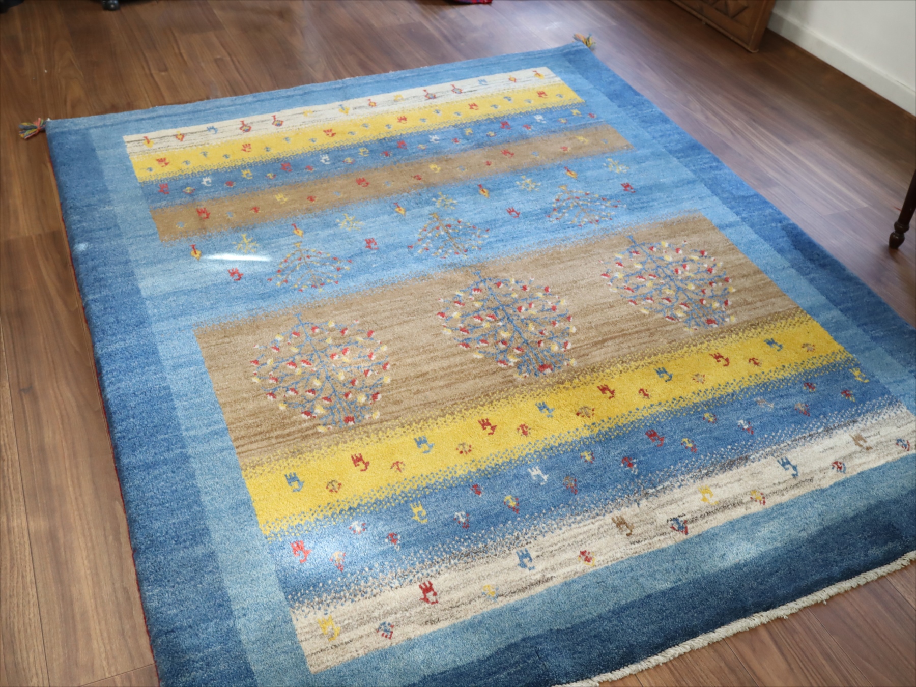 ギャッベ イラン産手織り 202x160cm ブルー&イエロー 生命の木 毛足の長いふかふかな織り