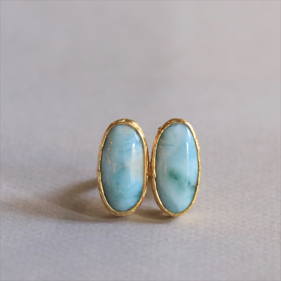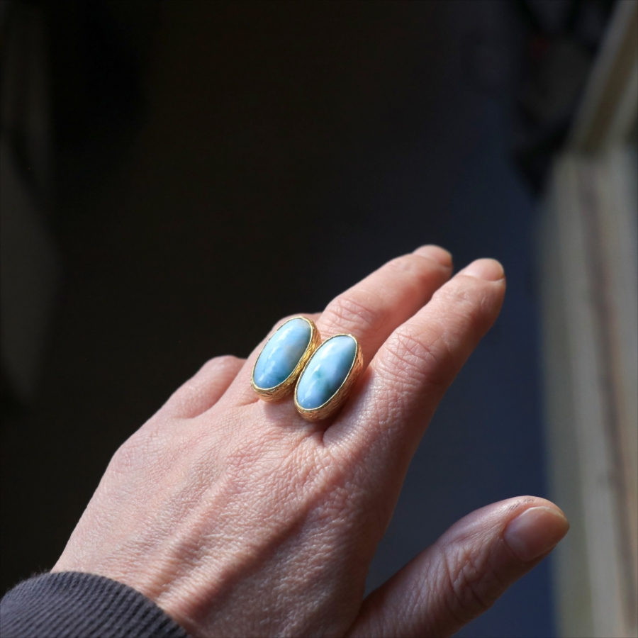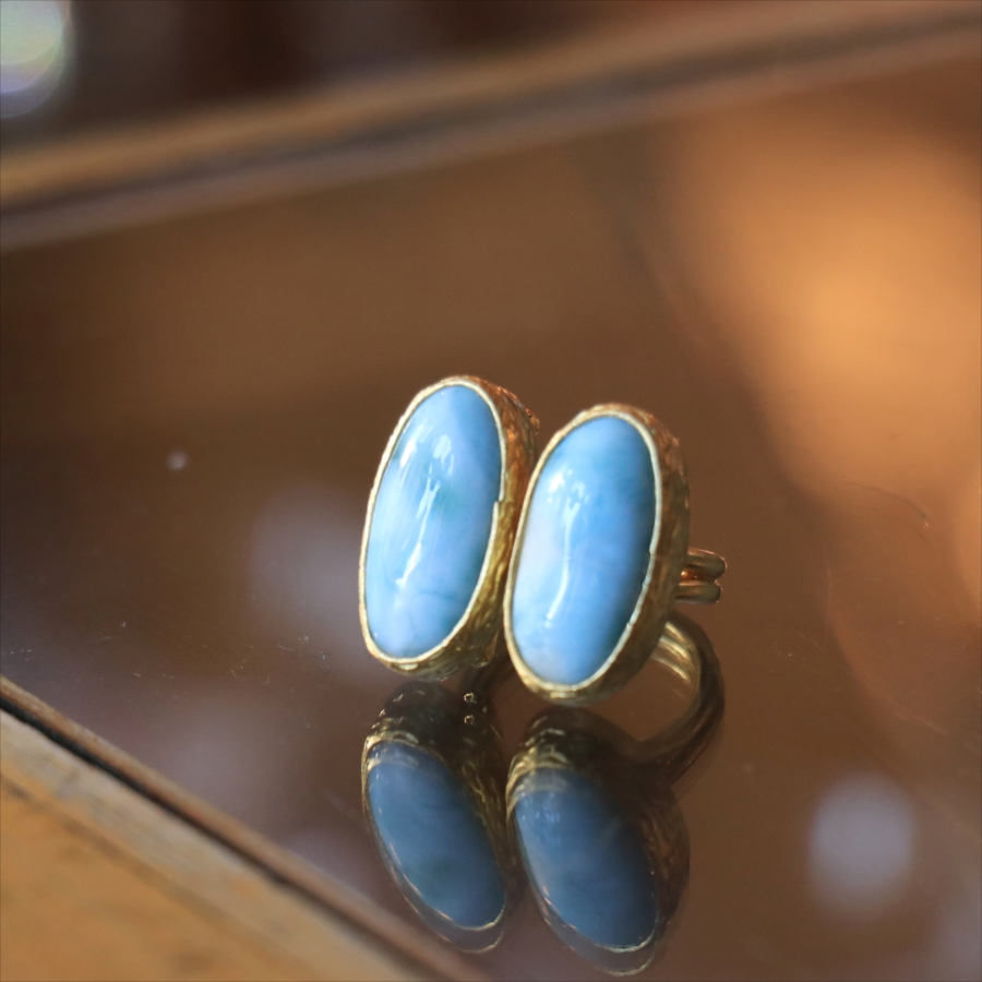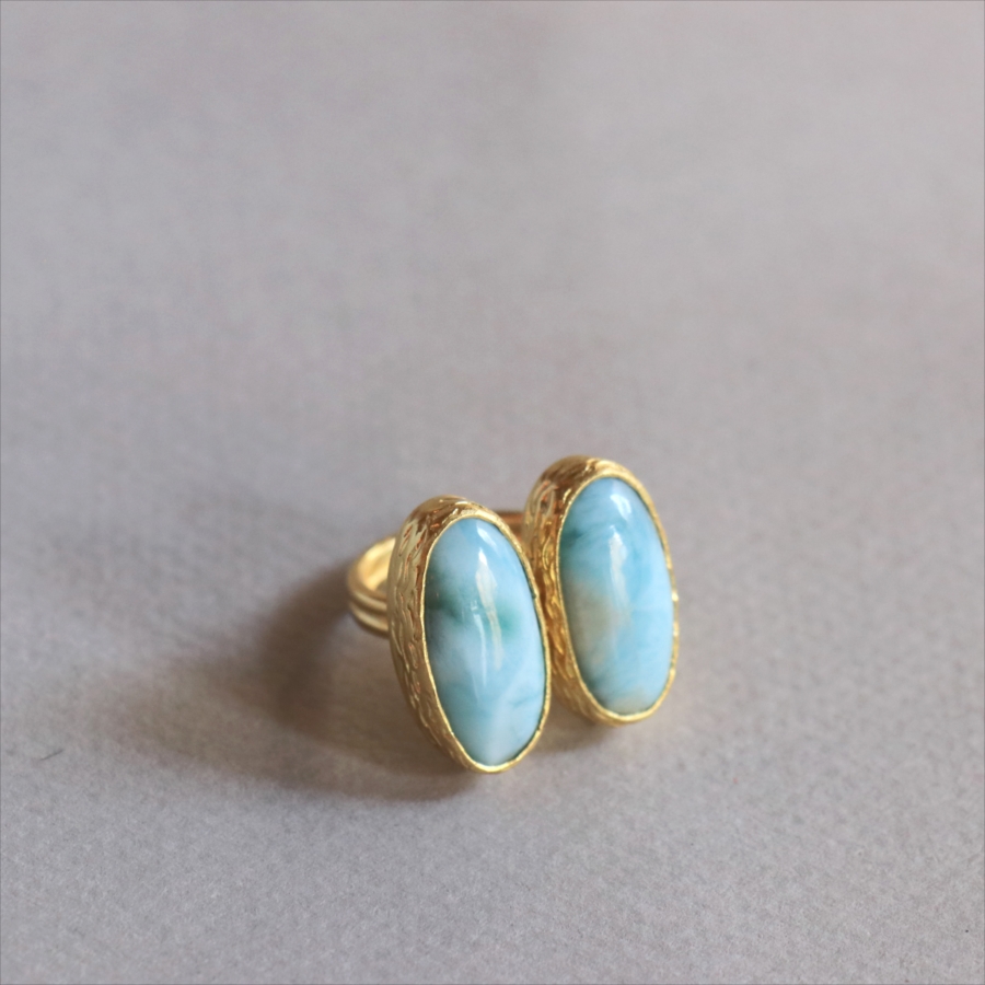 海に映る雲のような模様が広がる、優しいブルーが美しいラリマーダブルリングです。双子のように並ぶオーバルのラリマー。シンプルながらも個性的が光る一点ものジュエリーです。