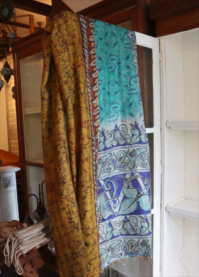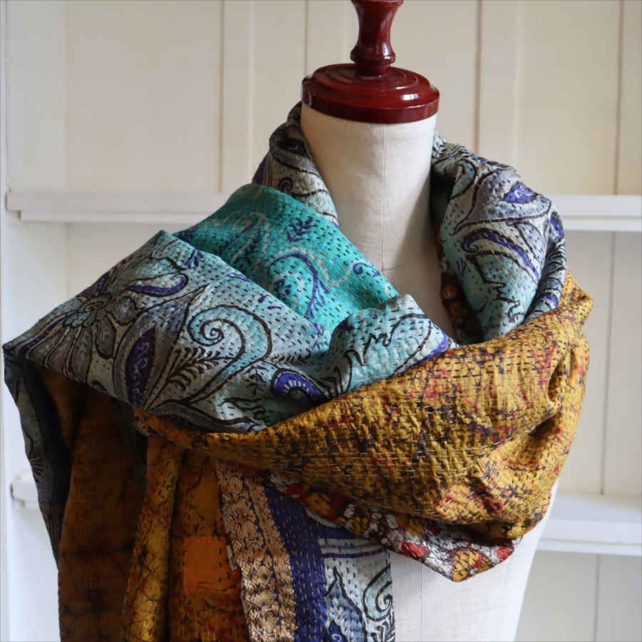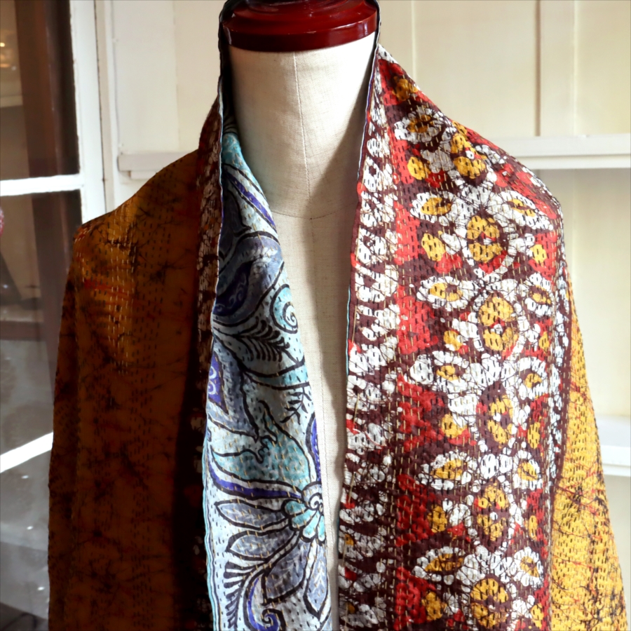 - カンタ刺繍 シルクストール Kantha embroidery, India 217×96cm 【一点もの 現品】大判サイズ 幅広