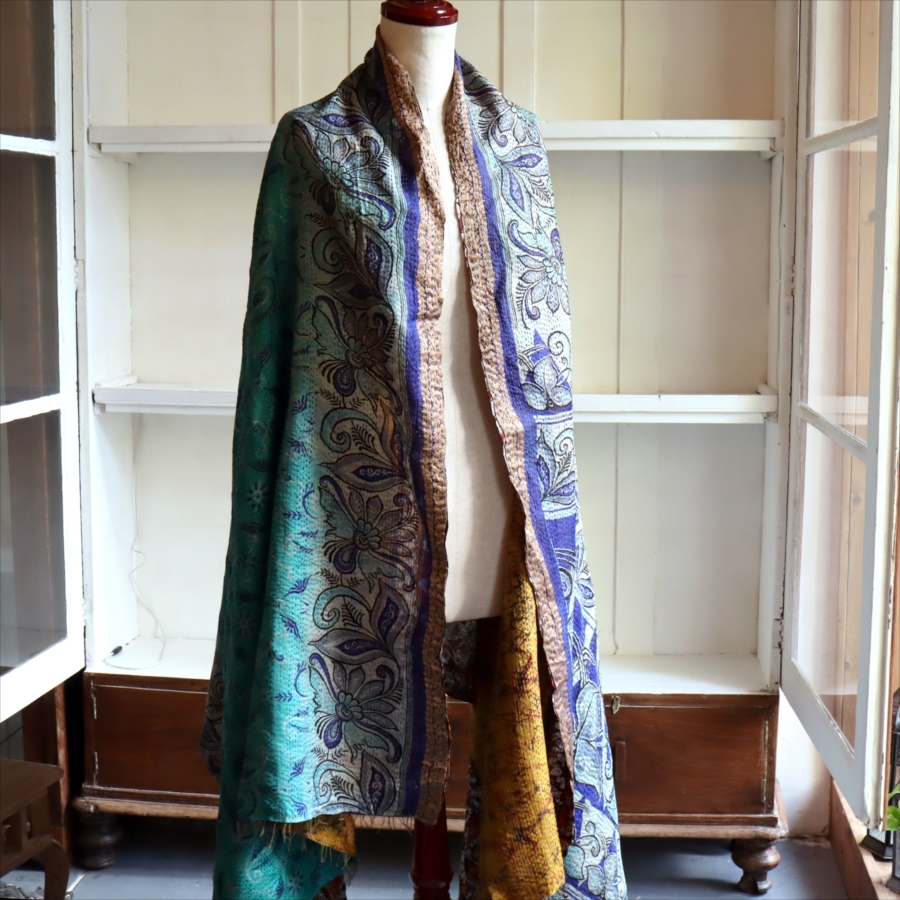 カンタ刺繍 シルクストール Kantha embroidery, India 217×96cm 【一点もの 現品】大判サイズ 幅広