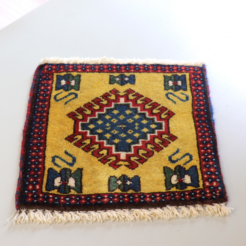 30cm角のミニサイズのラグ。小さいながらも、織りはしっかりしていて本格的です。多少ゆがみが気になりますが、ゆがみも含めて素朴な感じをお楽しみいただければと思います。