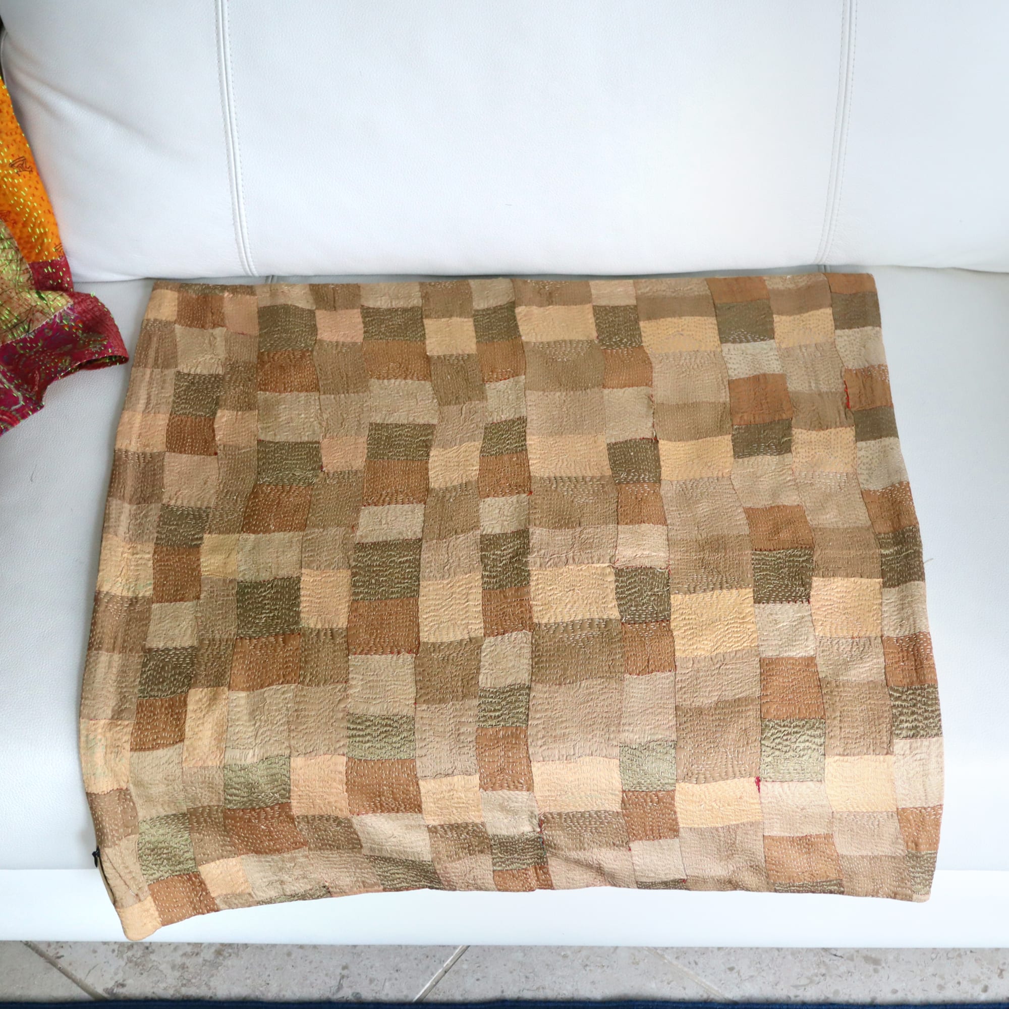 - カンタ刺繍 シルク クッションカバー59×58cm モザイクパッチワーク ベージュ&ブラウン