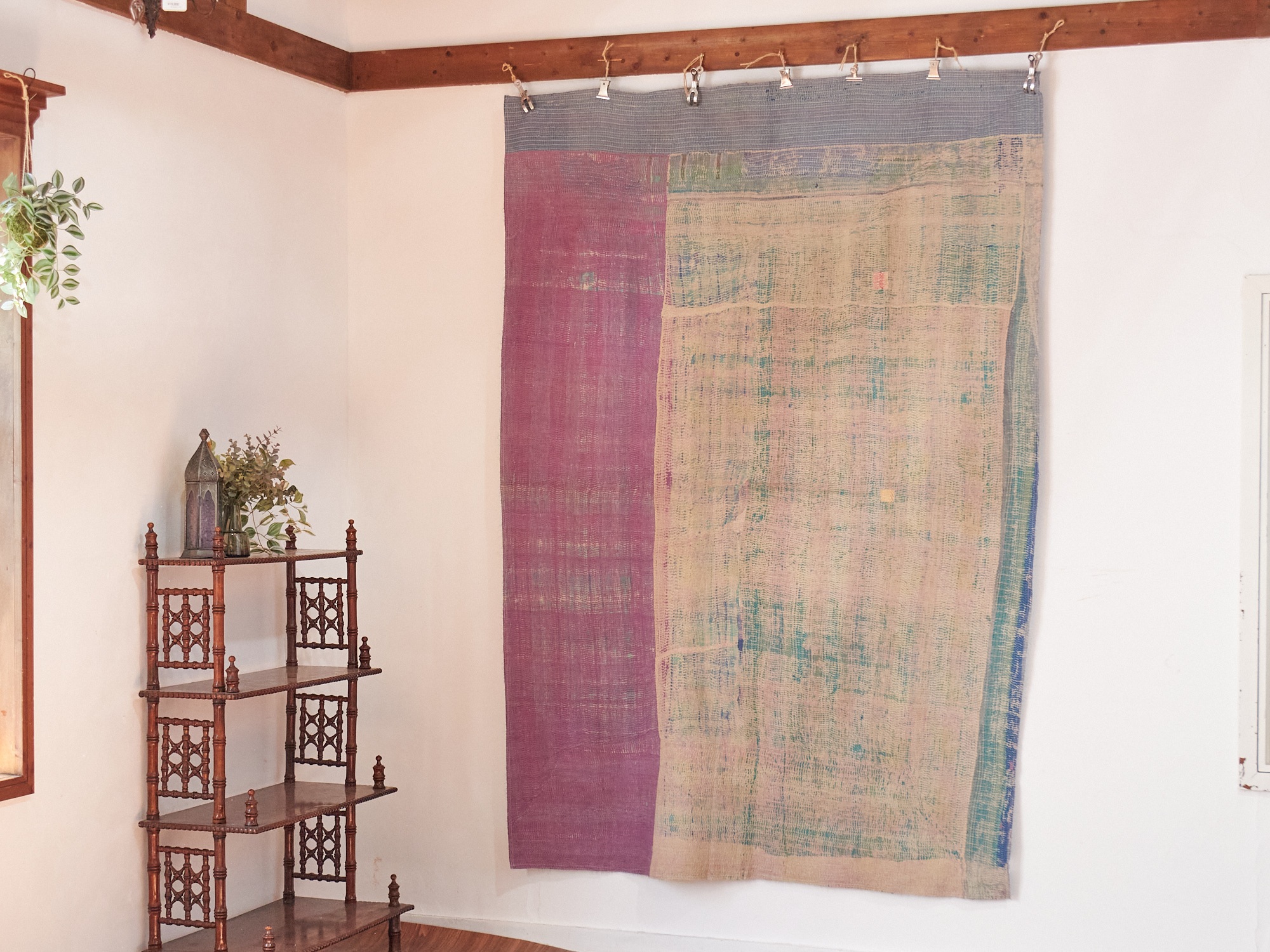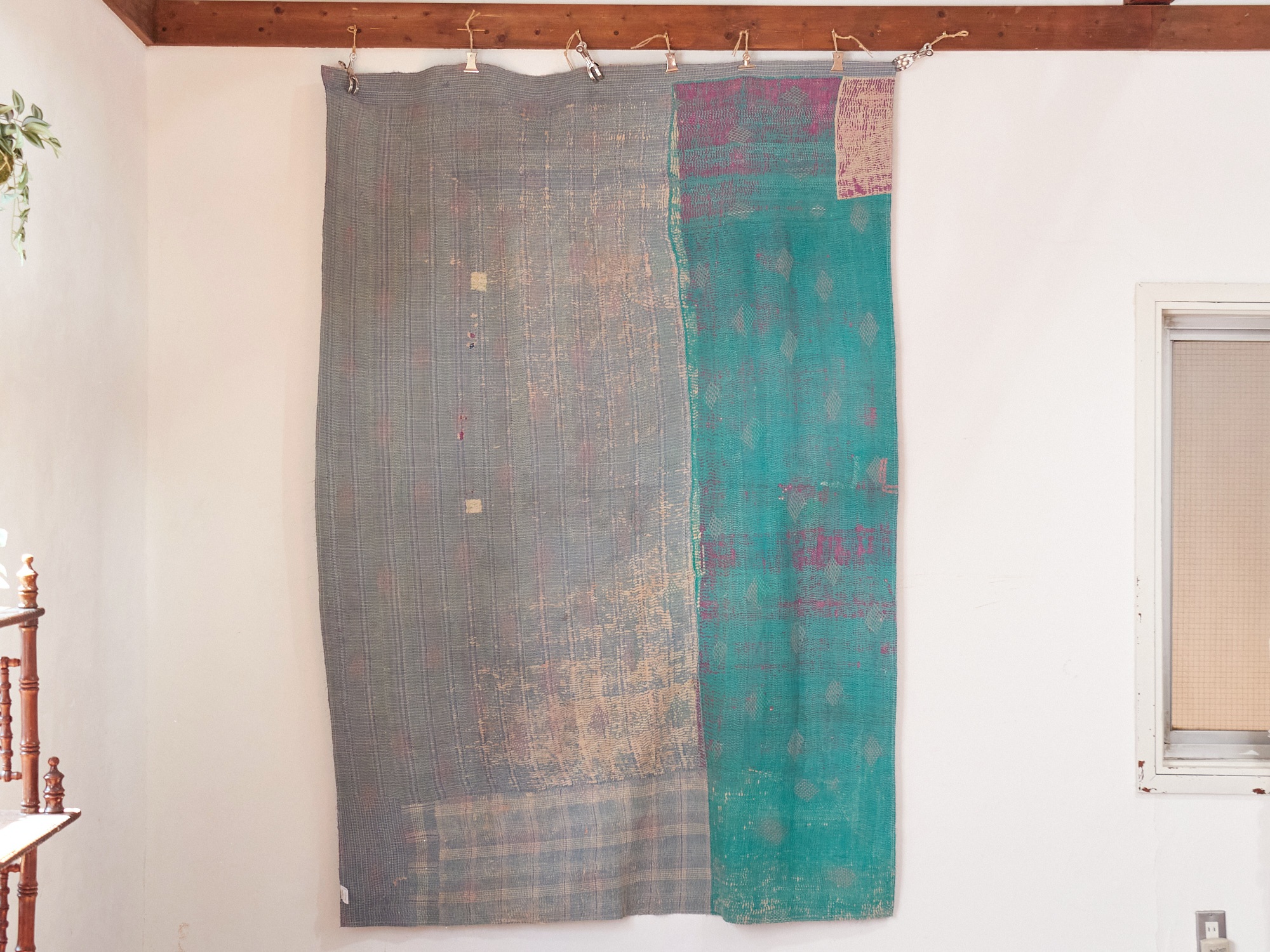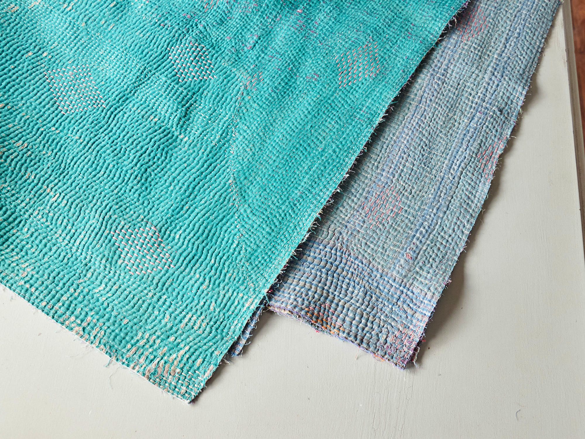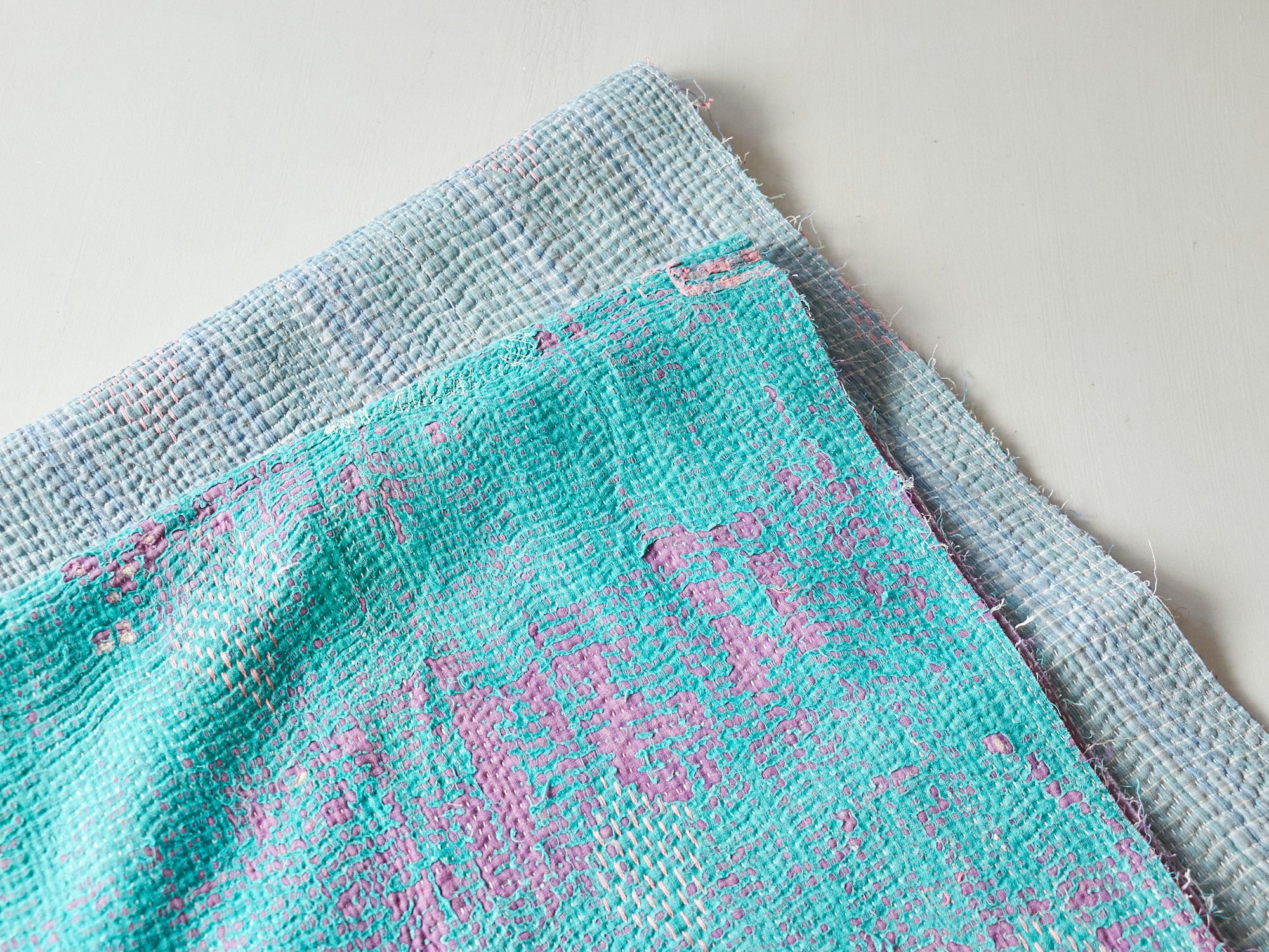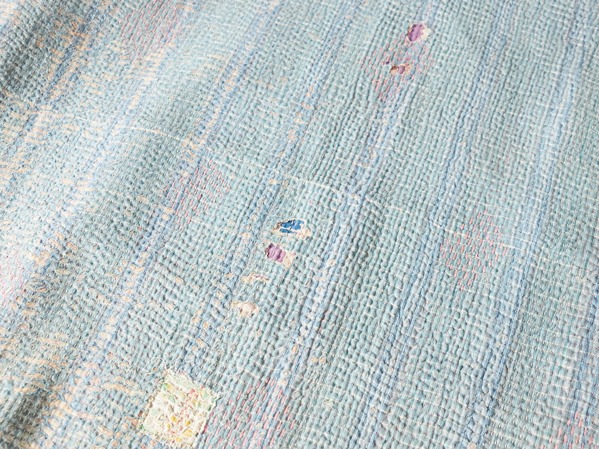 ベンガル地方(インド)で、寝具用として作られたコットンの刺し子刺繍です。着古した衣類などを再利用してあり、表面はすり減ったところも見られます。