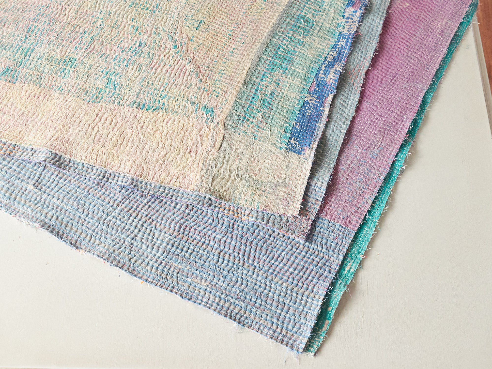 【カンタ刺繍(kantha embroidery)】インド東部からバングラディシュにわたるベンガル地方で、古くから伝統的に作られてきた刺繍布。伝統的なものは、刺繍をするベースに古布が用いられ、ランニングステッチ(日本の刺し子に近い)で、シンプルなラインや時には小さなモチーフが表現されています。作られた布は、掛け布団(キルト加工がされる)、ショール、鏡カバー、その他生活の様々な道具として使われました。19世紀の緻密なカンタ刺繍などは博物館に所蔵されているものも多くありますので、ぜひ画像検索などでごらんになってみてください。