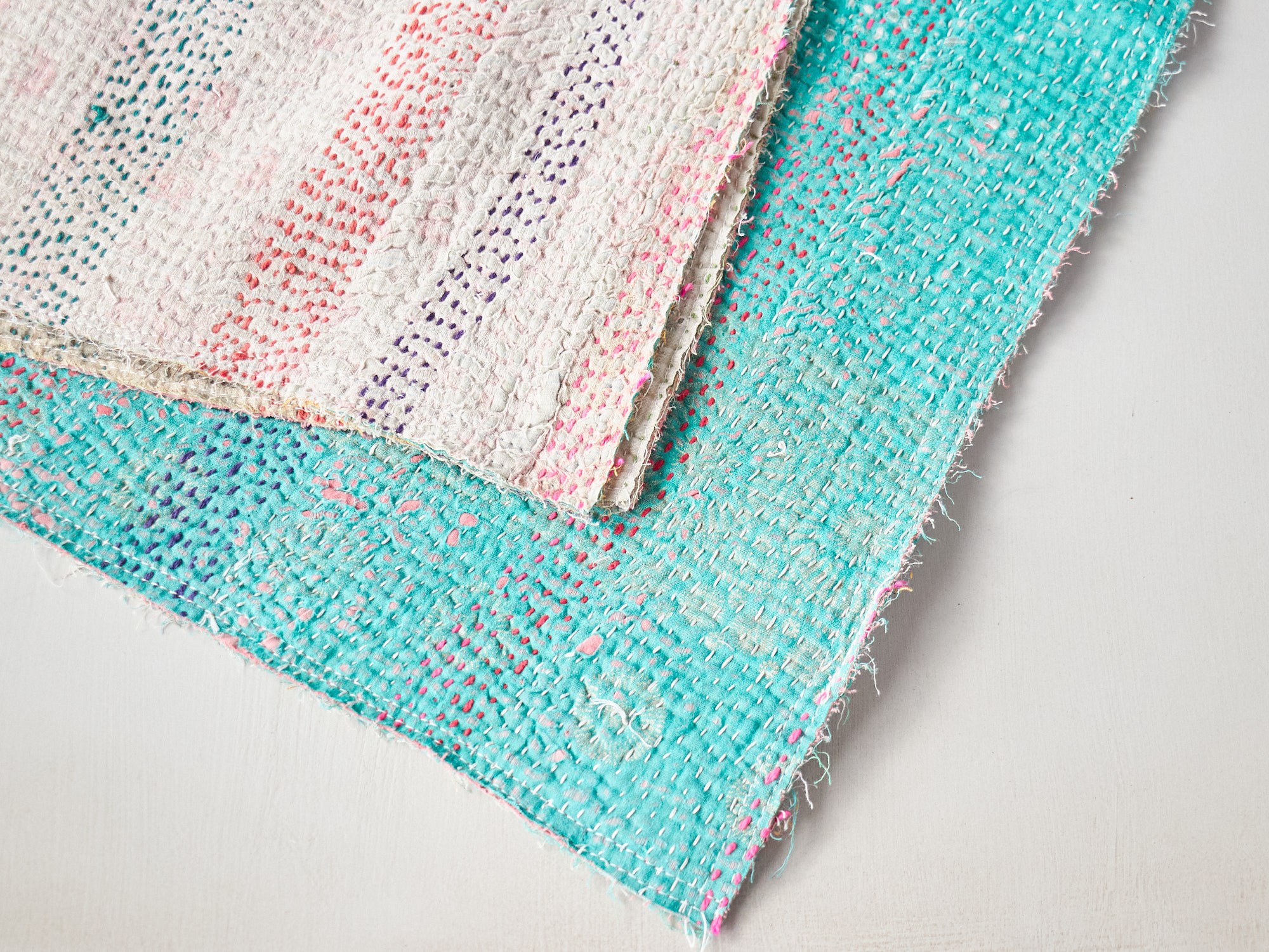 【カンタ刺繍(kantha embroidery)】インド東部からバングラディシュにわたるベンガル地方で、古くから伝統的に作られてきた刺繍布。伝統的なものは、刺繍をするベースに古布が用いられ、ランニングステッチ(日本の刺し子に近い)で、シンプルなラインや時には小さなモチーフが表現されています。作られた布は、掛け布団(キルト加工がされる)、ショール、鏡カバー、その他生活の様々な道具として使われました。19世紀の緻密なカンタ刺繍などは博物館に所蔵されているものも多くありますので、ぜひ画像検索などでごらんになってみてください。