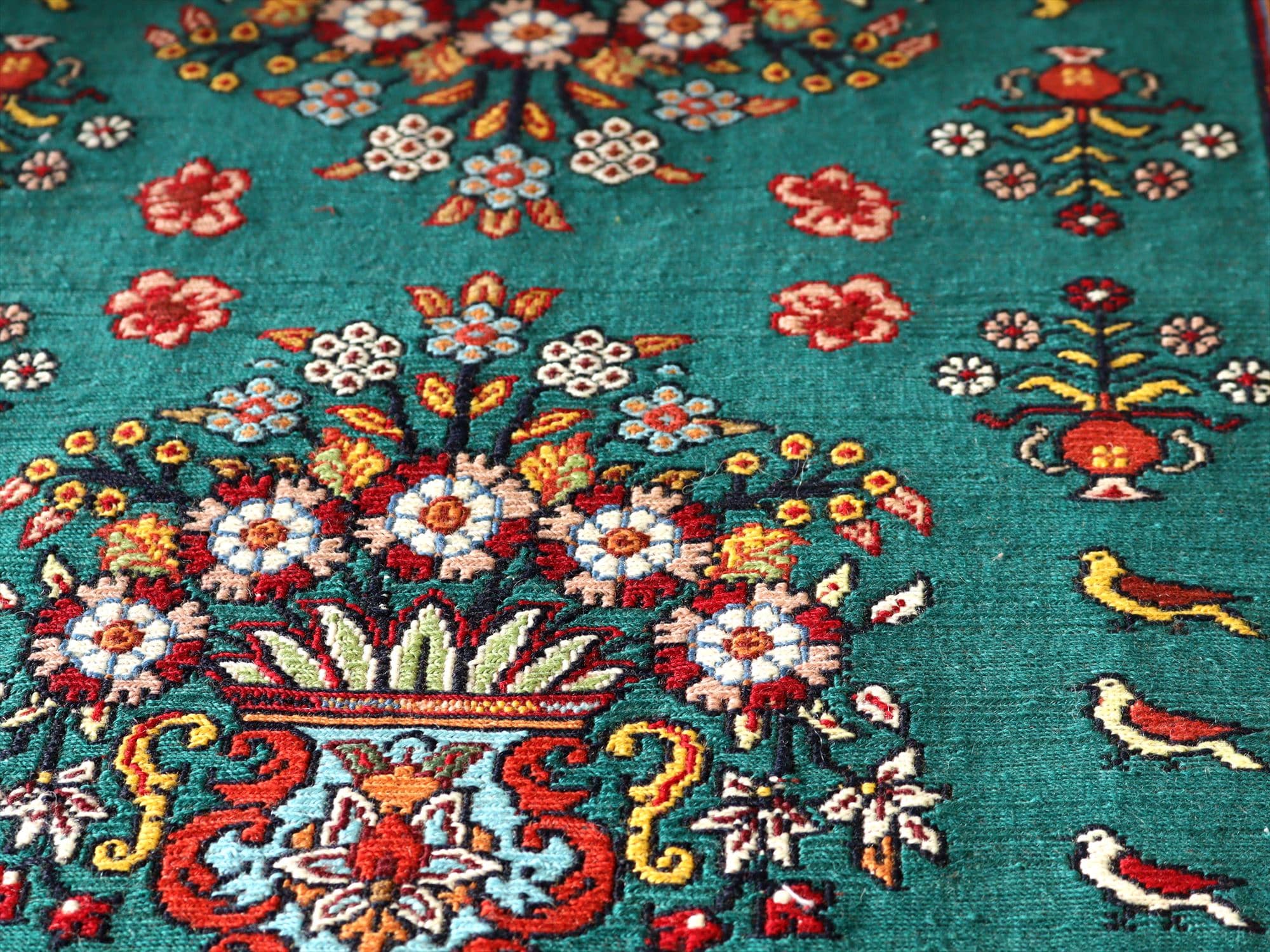 - 細かな織りのスマックキリム87×59cm 花と鳥 ぺトロールグリーン