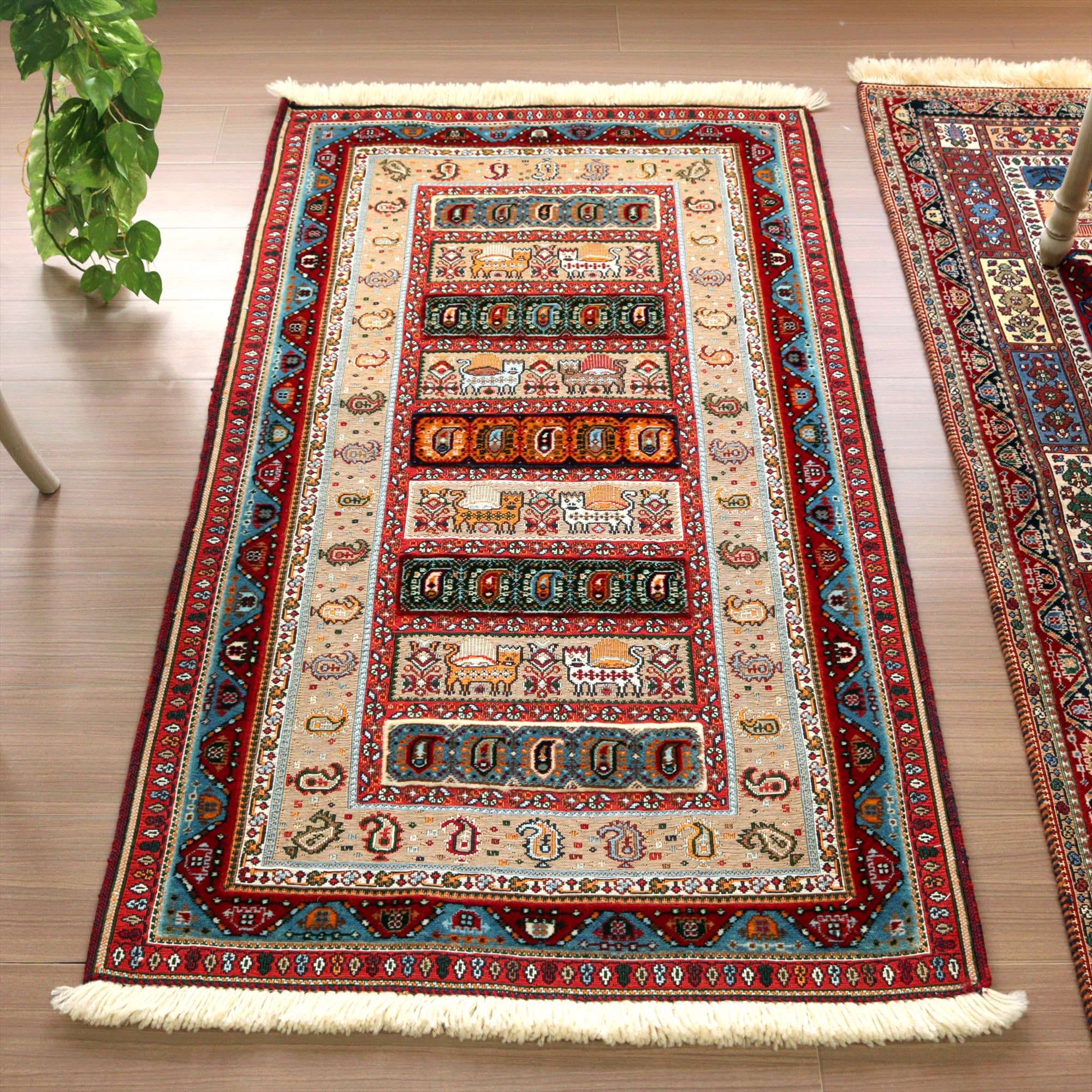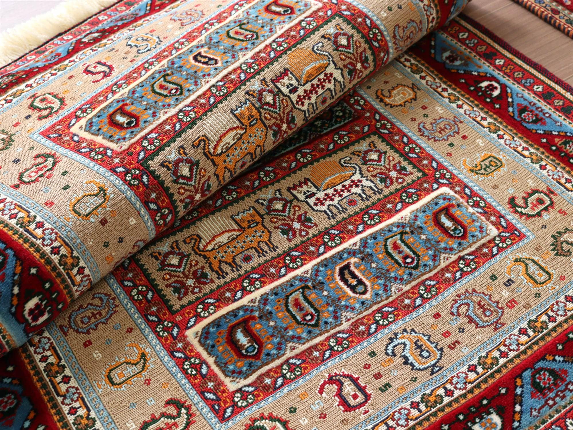 緻密で細かな織りのスマックと、立体的で滑らかな肌触りのカーペット織りのコンビネーション。ボテ(ペイズリー)と、サーベルを持ったライオンのモチーフが織られたユニークなデザインの1枚。