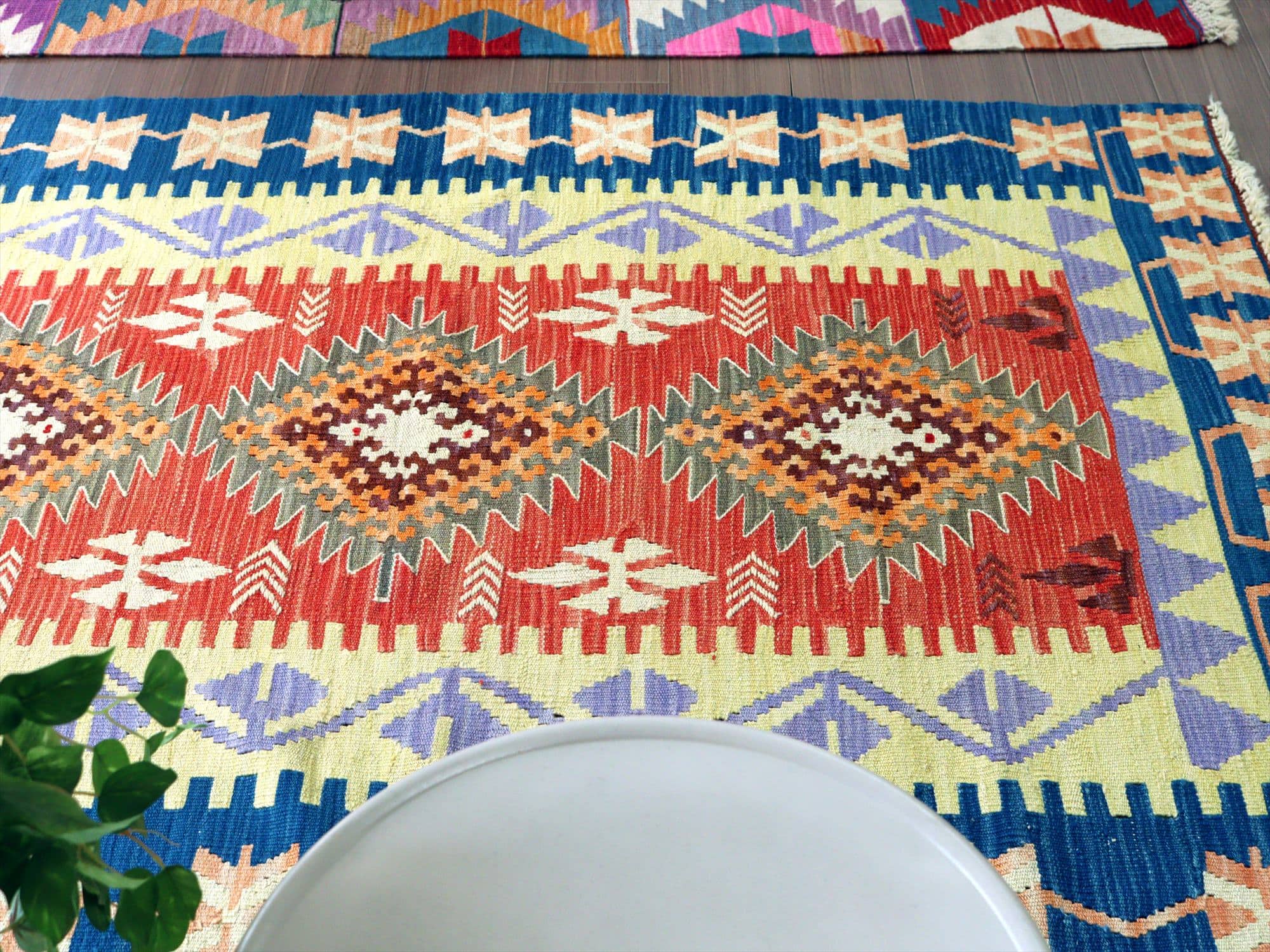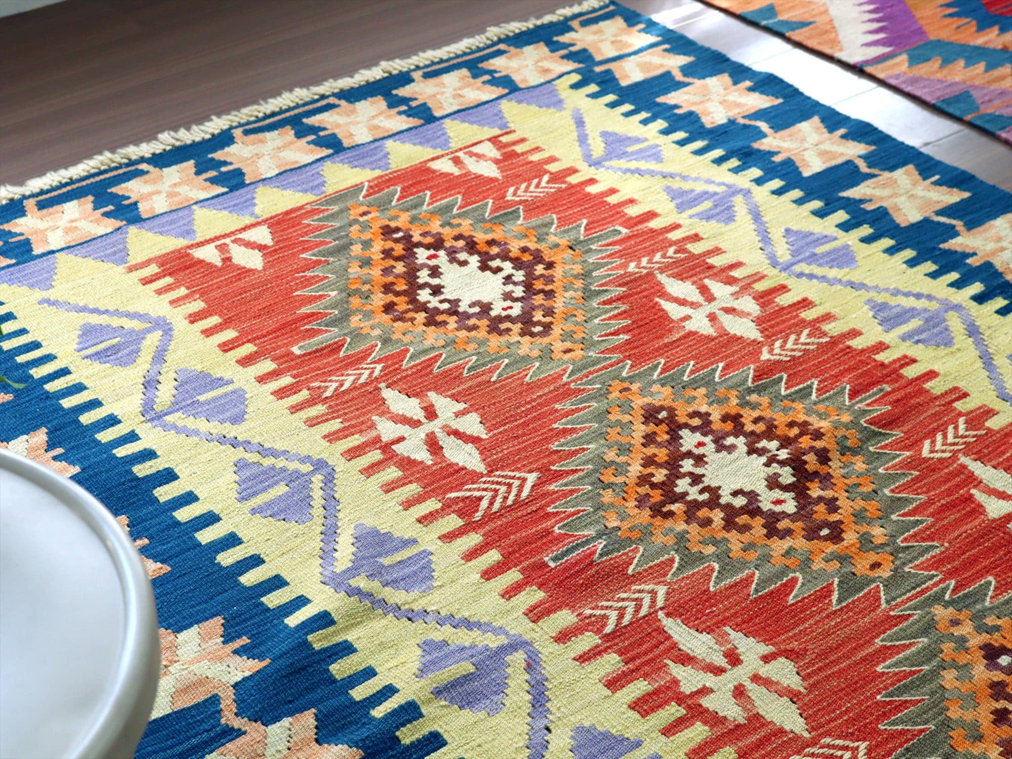 織り地がしなやかでやわらかいのがカイセリキリムの特徴です。やや厚みがあり、やさしい肌触り。色の切り替え部分には、キリムの織りの特徴で、縦に隙間が開いています(スリットと呼んでいます)。