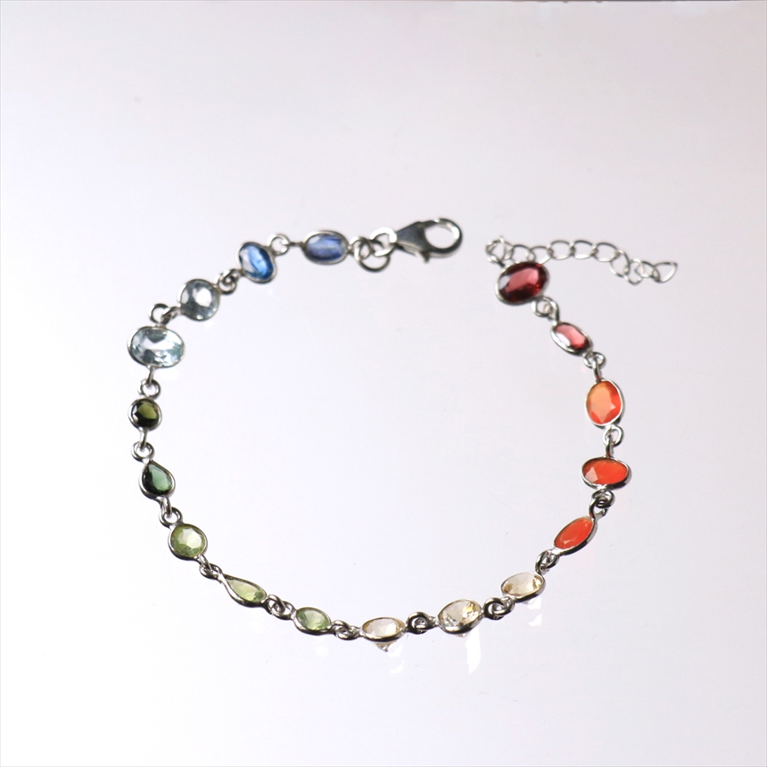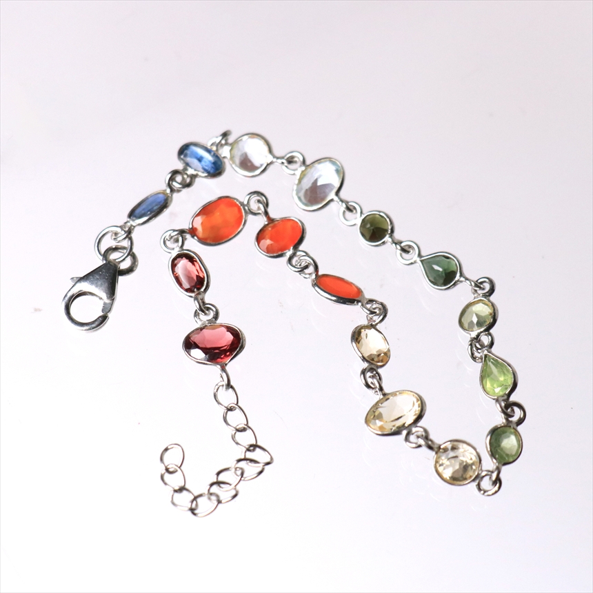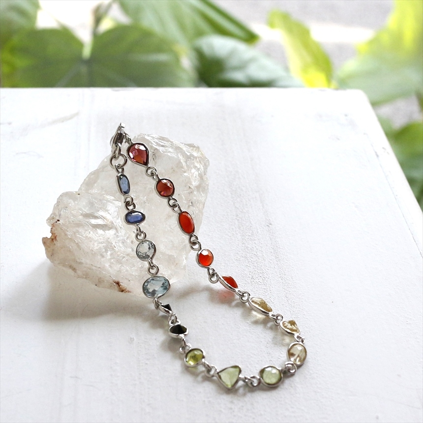 ガーネット2粒(赤)、カーネリアン3粒(オレンジ)、シトリン3粒(薄黄色)、ペリドット3粒(ライムグリーン)、グリーントルマリン2粒(モスグリーン)、ブルートパーズ2粒(クリアブルー)、カイヤナイト2粒(ブルー)の7種類のストーンが贅沢につながれたブレスレット。一粒一粒の石の色彩が艶やかで大変美しく、光があたるたびにきらめき華やかで気品を感じます。※石一粒縦横0.5~0.8cm