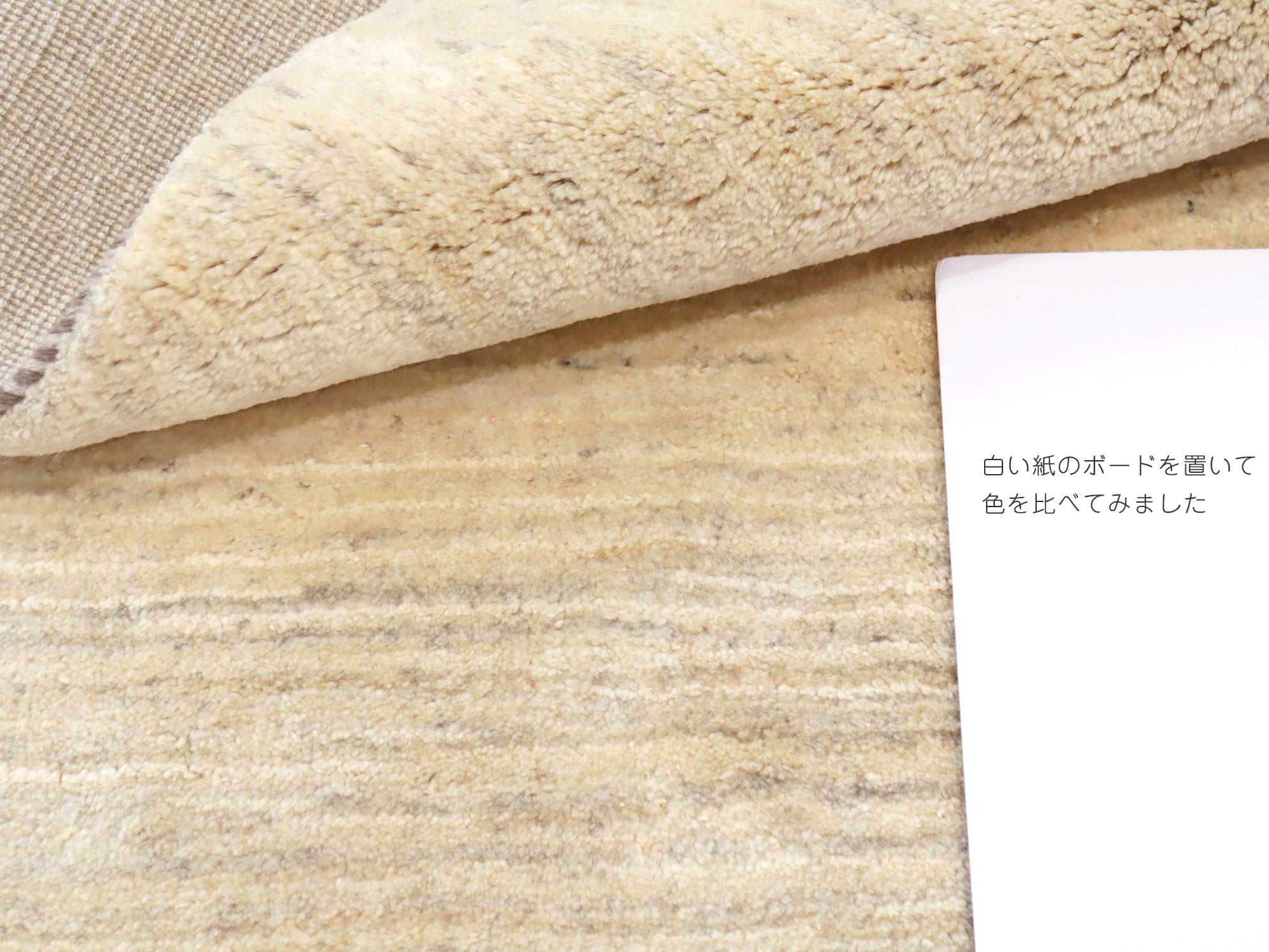 自然光の下では、あまり黄色っぽさは出ませんが、羊の原毛ですので真っ白ではなくベージュです。パイル(毛足)の流れがあるので、逆方向からみると白っぽく明るく見えます。