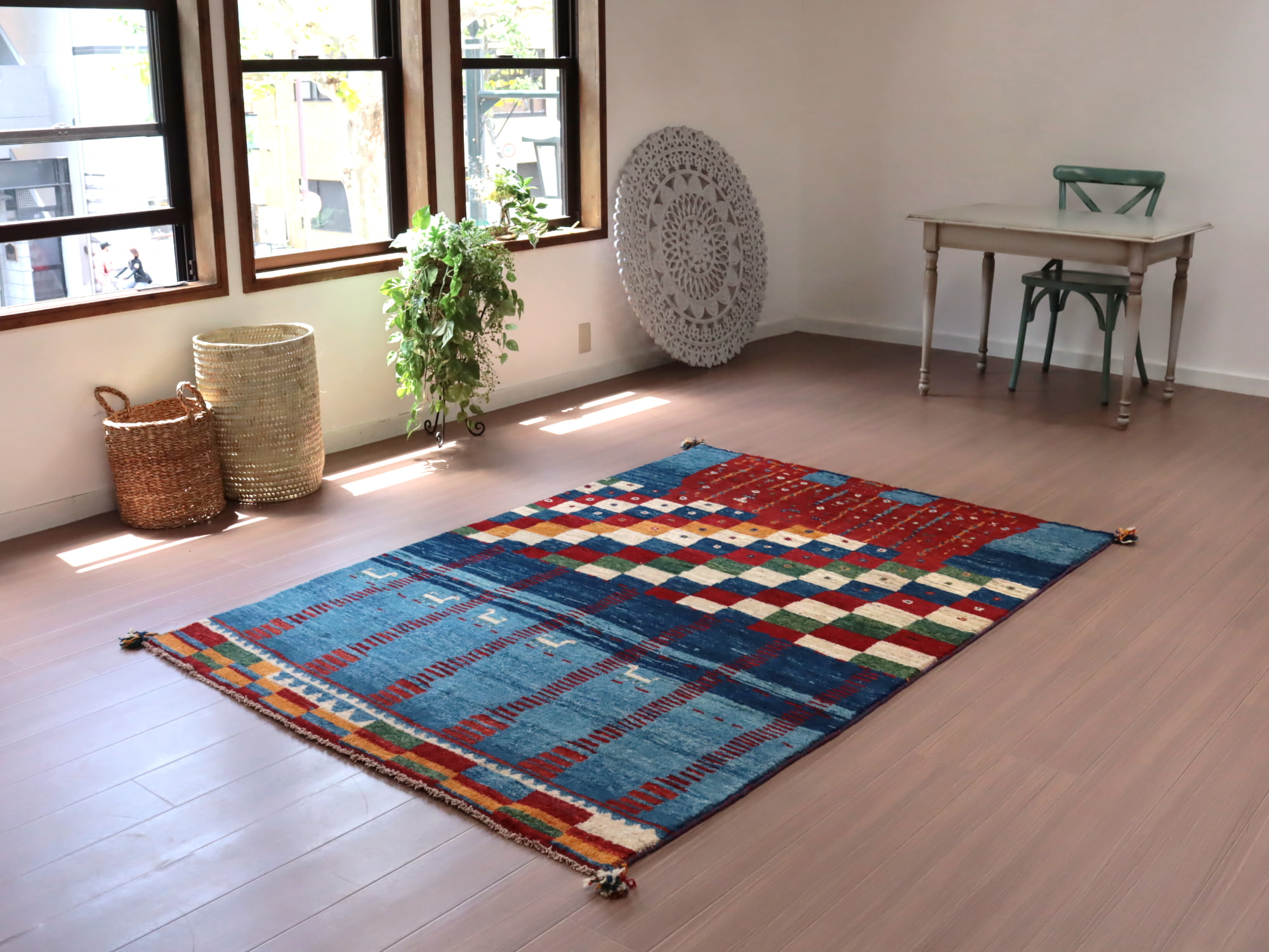 ギャッベ カシュカイ族の手織りラグ アマレバフ212×146cm ブルー カラフルタイル