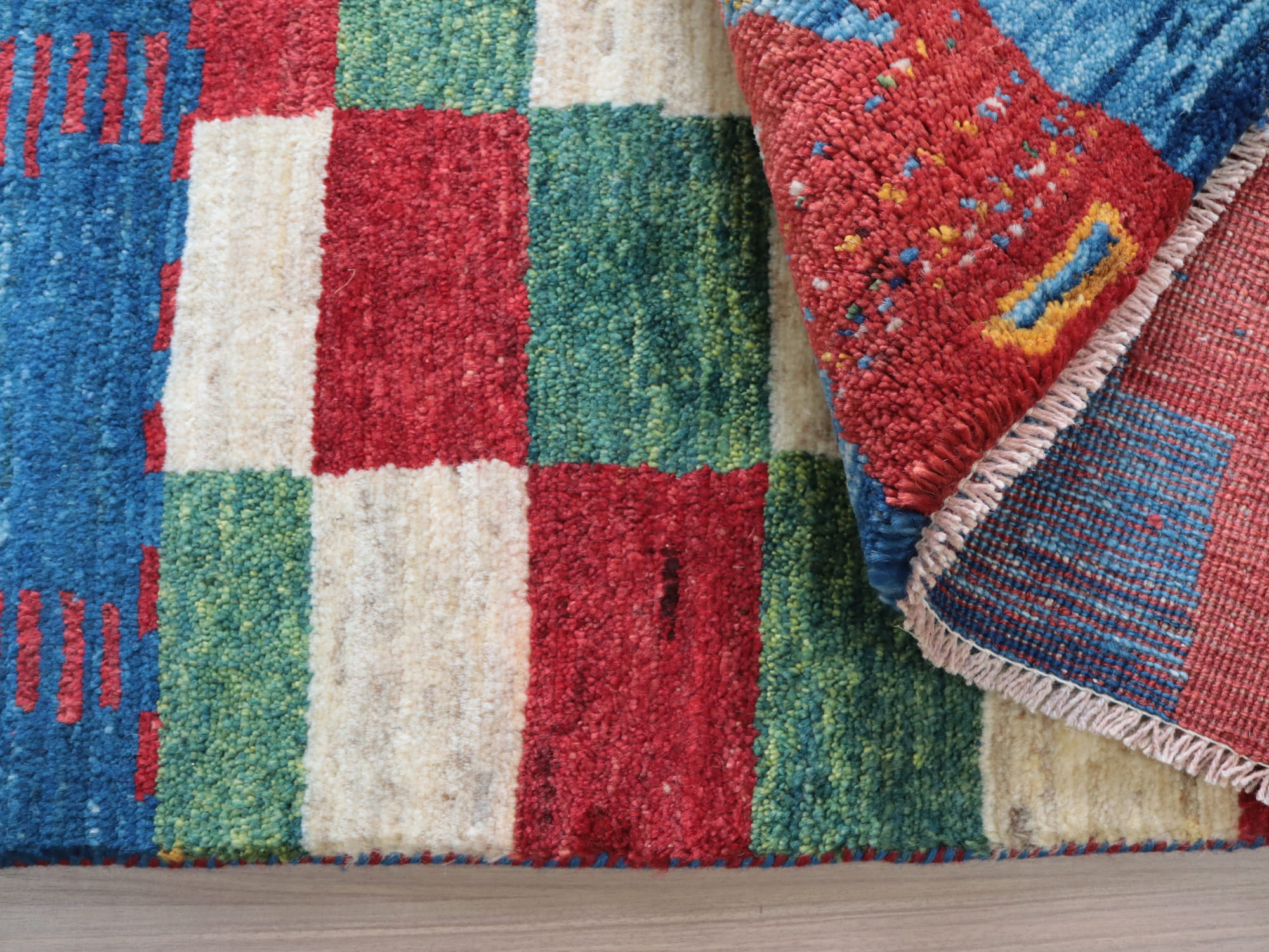 - ギャッベ カシュカイ族の手織りラグ アマレバフ212×146cm ブルー カラフルタイル