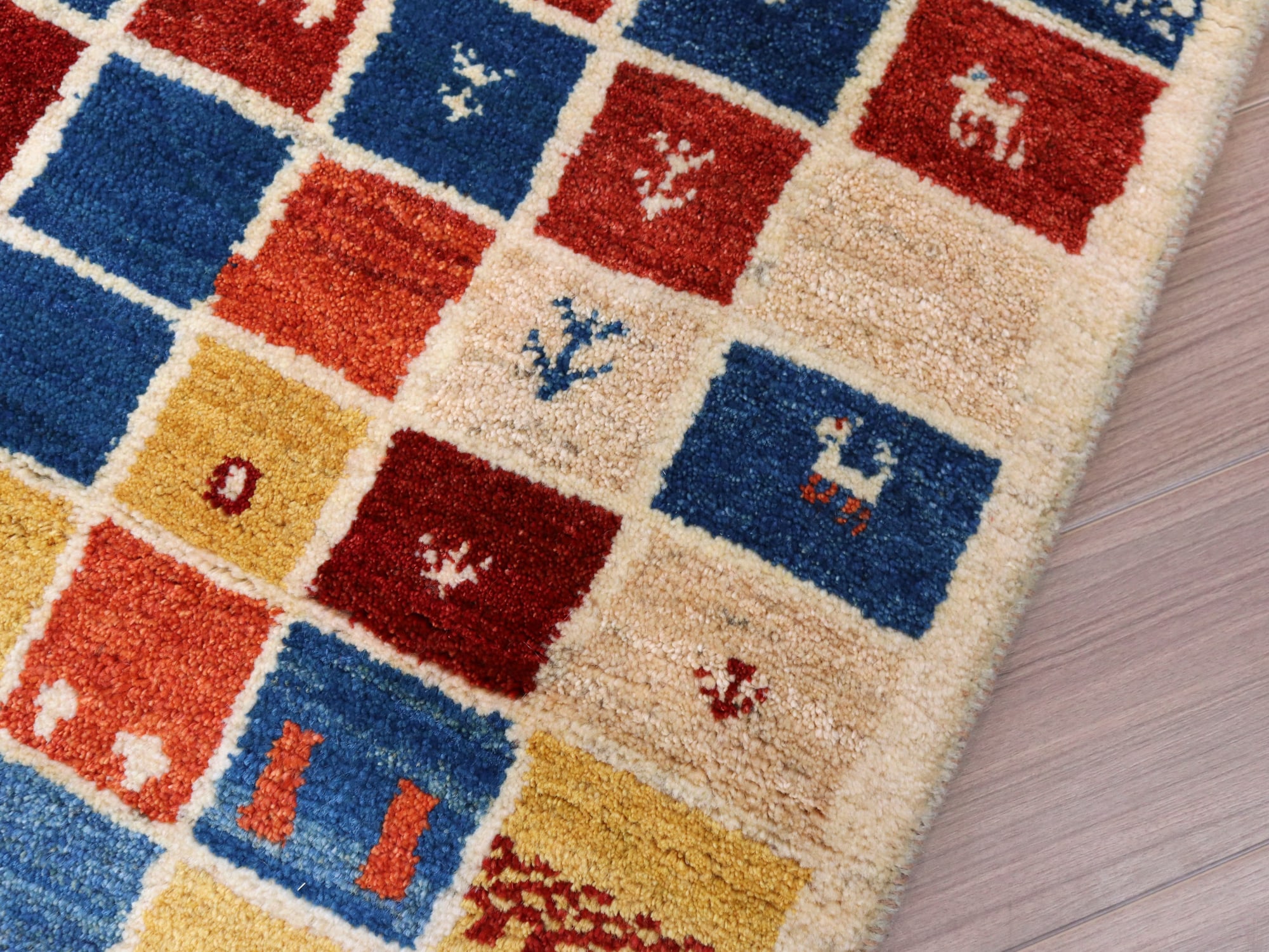 【ギャッベ・ノマド - Gabbeh Nomad -】遊牧民を意味するノマドと名付けられたギャッベ・コレクション。元来、ギャッベとは、毛足の長いラグを意味し、このクラスの織りの織物のことをいいます。ふかふかした厚みがあります。じゅうたんの織りはざっくり織りで、ギャッベの中で最もベーシックな織りのグレードです。デザインは、遊牧民本来の自由な感性や、長く織り継がれてきた伝統を生かしたものが多く、シンプルな単色のものからカラフルなタイル柄など、様々なデザインが織られています。ヤギやヒツジなどの動物、生命の樹などの定番モチーフが織り込まれていることが多く、一般的にイメージされる「ギャッベらしさ」が一番感じられるスタンダードなクラスです。