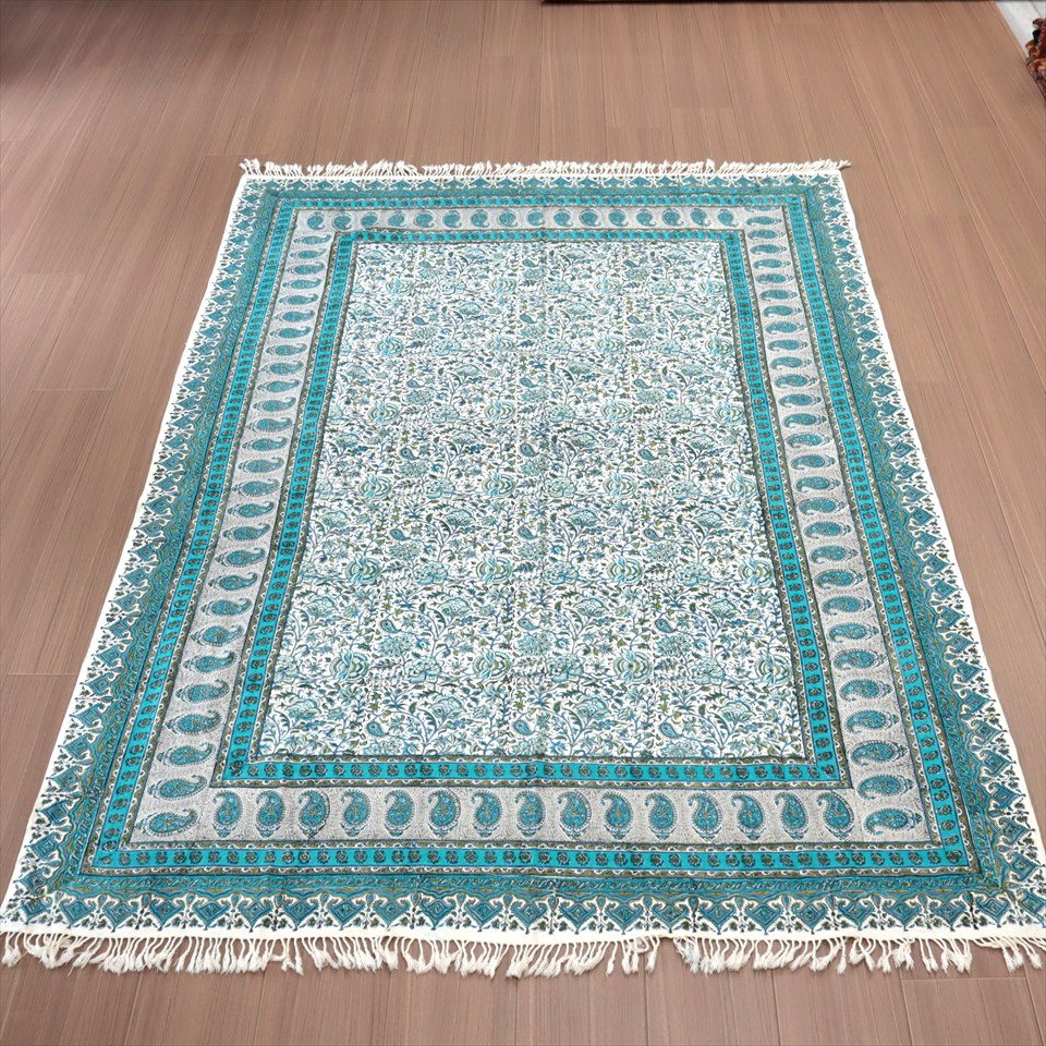ペルシャ更紗 ガラムカール 190x132cm アンティークデザイン ブルーグリーン フラワー テーブルクロス ソファカバー