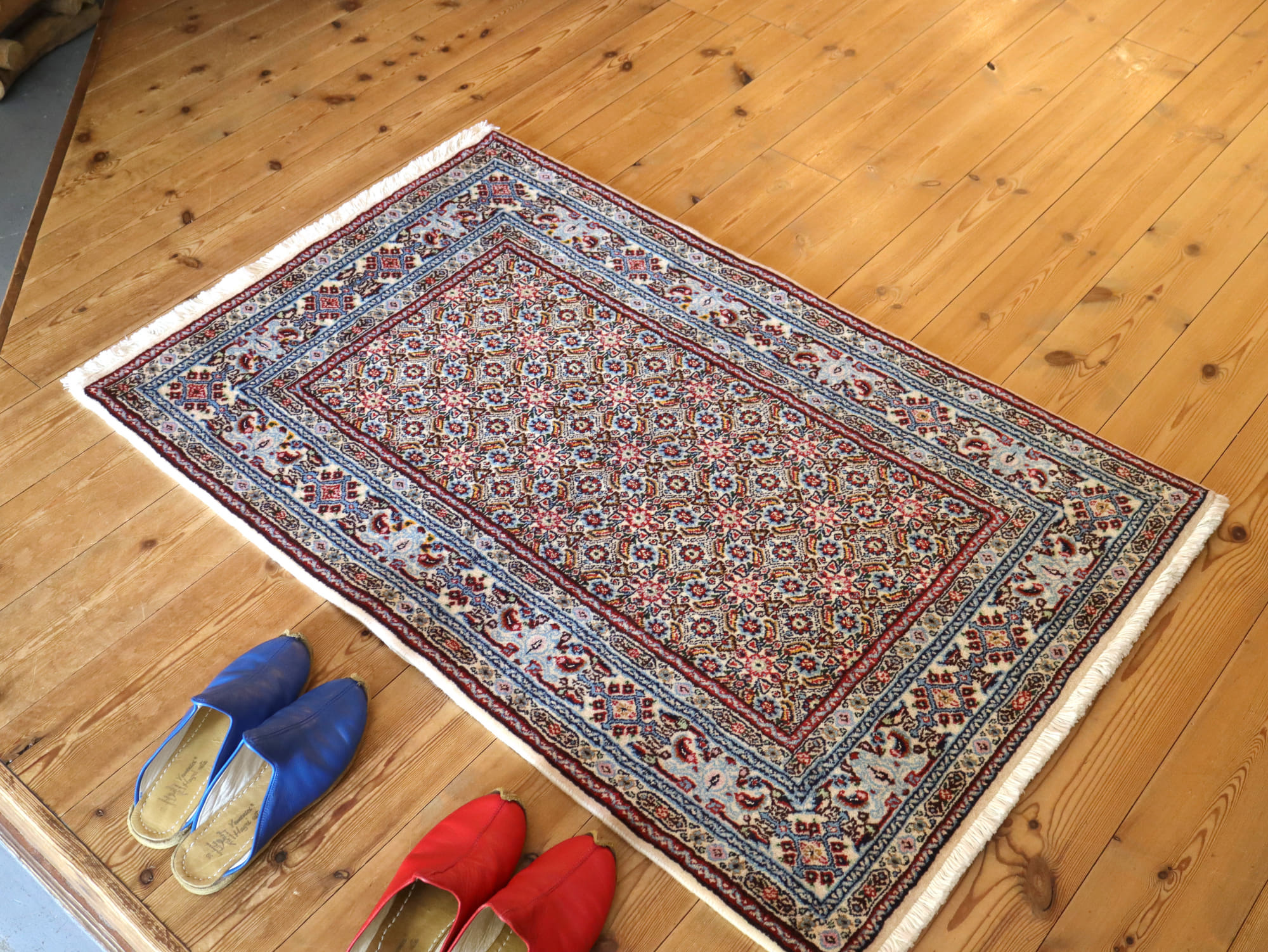 アイボリー色をベースに、オレンジやグリーンで細かな連続模様が織り込まれたムード産の手織り絨毯。イラン東部からアフガニスタンにも一般に見られるヘラート文様で、小さな花びらの形はマヒ(魚)と表現されることもあります。モチーフの一部にはシルクの糸が使われ、光の当たり方によってはキラッと光って見えます。