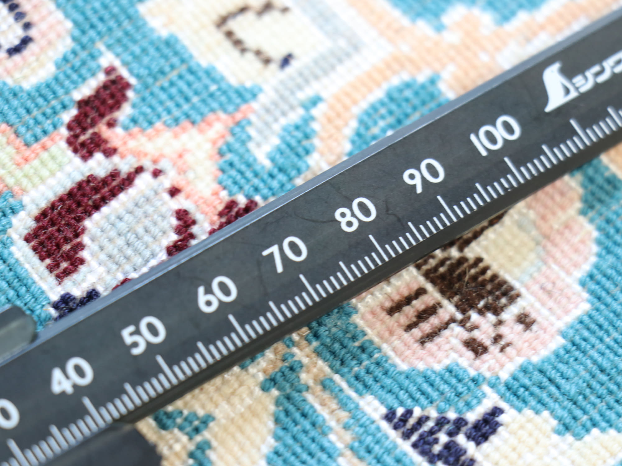 6Lと呼ばれる細い糸を使った織りで、10cmに70-80目ほどの細かな織りで引き締まった薄手のじゅうたんです。織りの厚みは約6mmで、引き締まった薄手のじゅうたんです。とても目が細かく、表面はツヤがあり滑らかな肌触り。