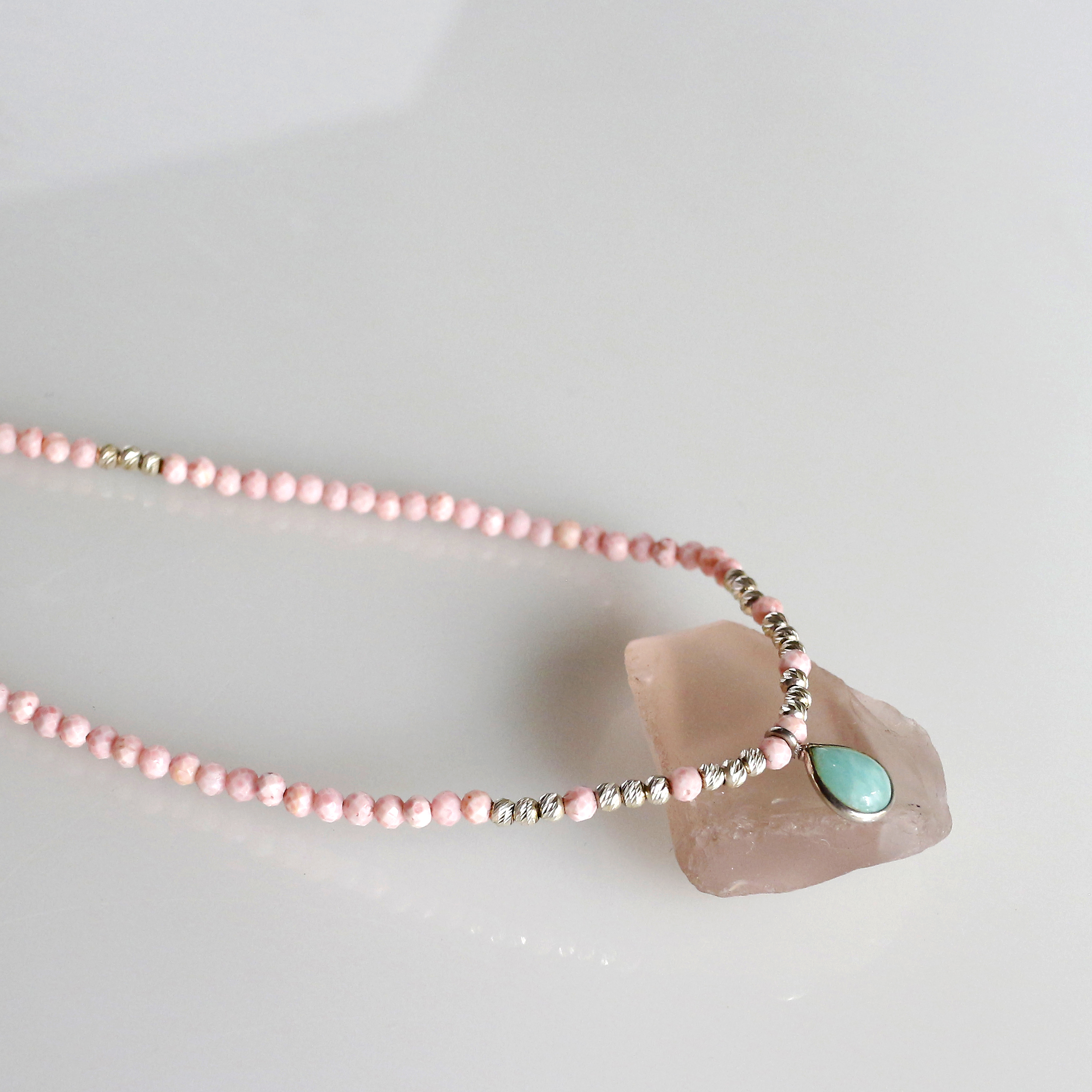ベビーピンクのクォーツに、ほんのりグリーンがかったマットでライトなブルーのアマゾナイトが一粒ついたネックレス。襟もとに沿うようにバランスよく、つけていただけます。
