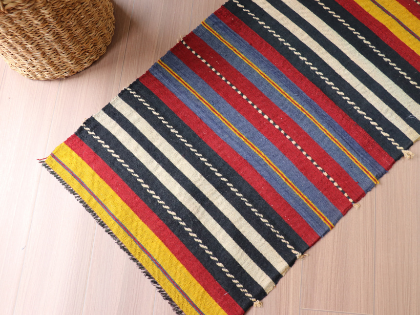 薄手でやわらかな織りのキリムで、もともとはブランケット(毛布)のような用途で使われていたキリムからのカット。はぎ合わせてあったときの名残りが両サイドに残っています。