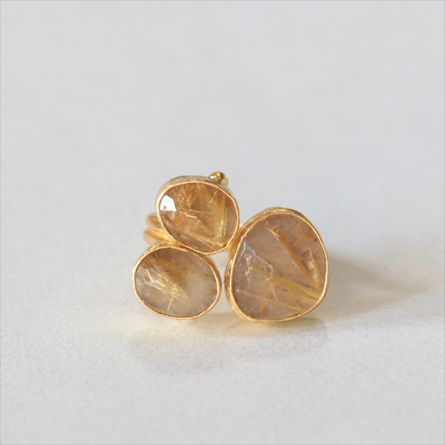天然のクォーツに針のようなインクルージョンがはいったルチルクォーツのリングです。同じシリーズの3つの石リングの中では、やや小振りで、普段使いでも活躍しそう。肌なじみの良いカラーは違和感なく、合わせやすくおすすめです。