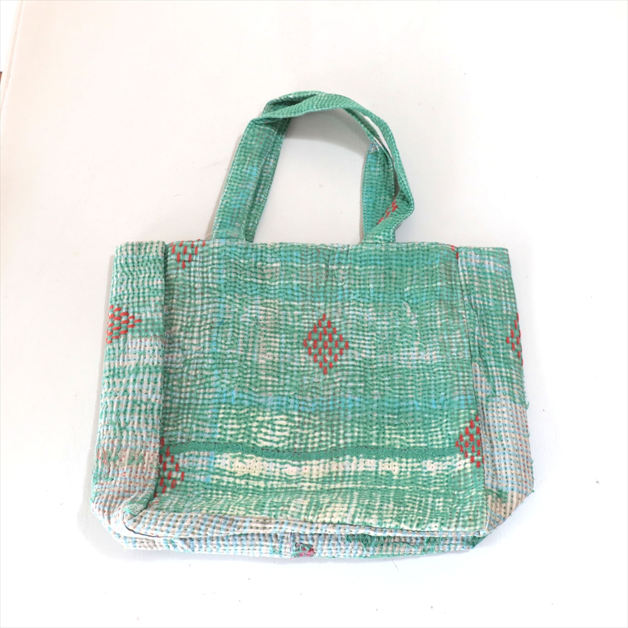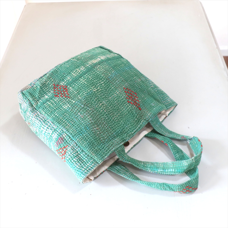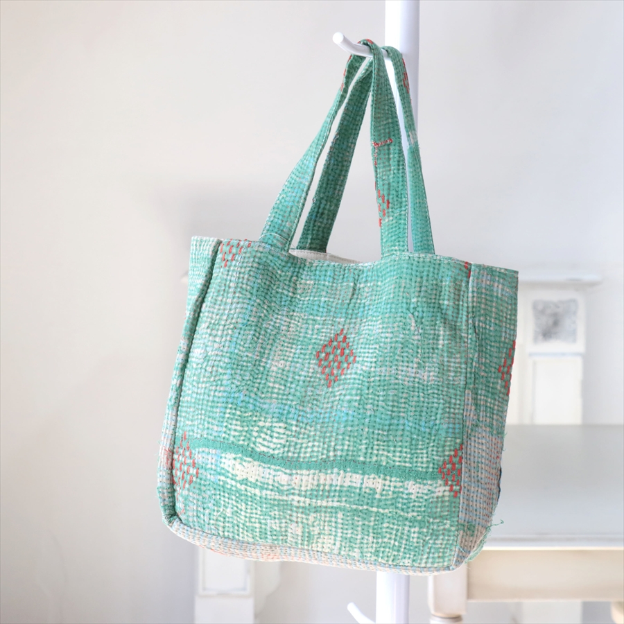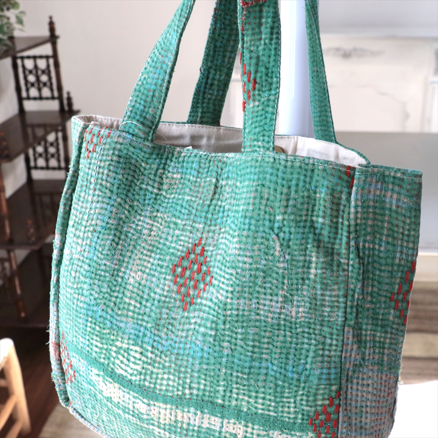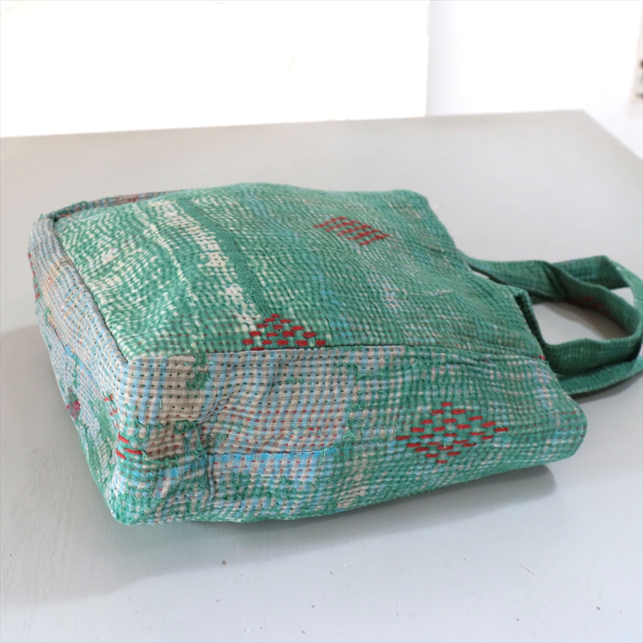 使い古された民族衣装のサリーやドゥパタを重ねて、刺し子刺繍をした伝統的な手仕事の布を使っています。表面のコットンは擦り切れているところもあるほど使い込まれていて、ヴィンテージ感たっぷり。コットンのやわらかな肌触りが心地よく、普段使いのバッグとして活躍してくれそうです。