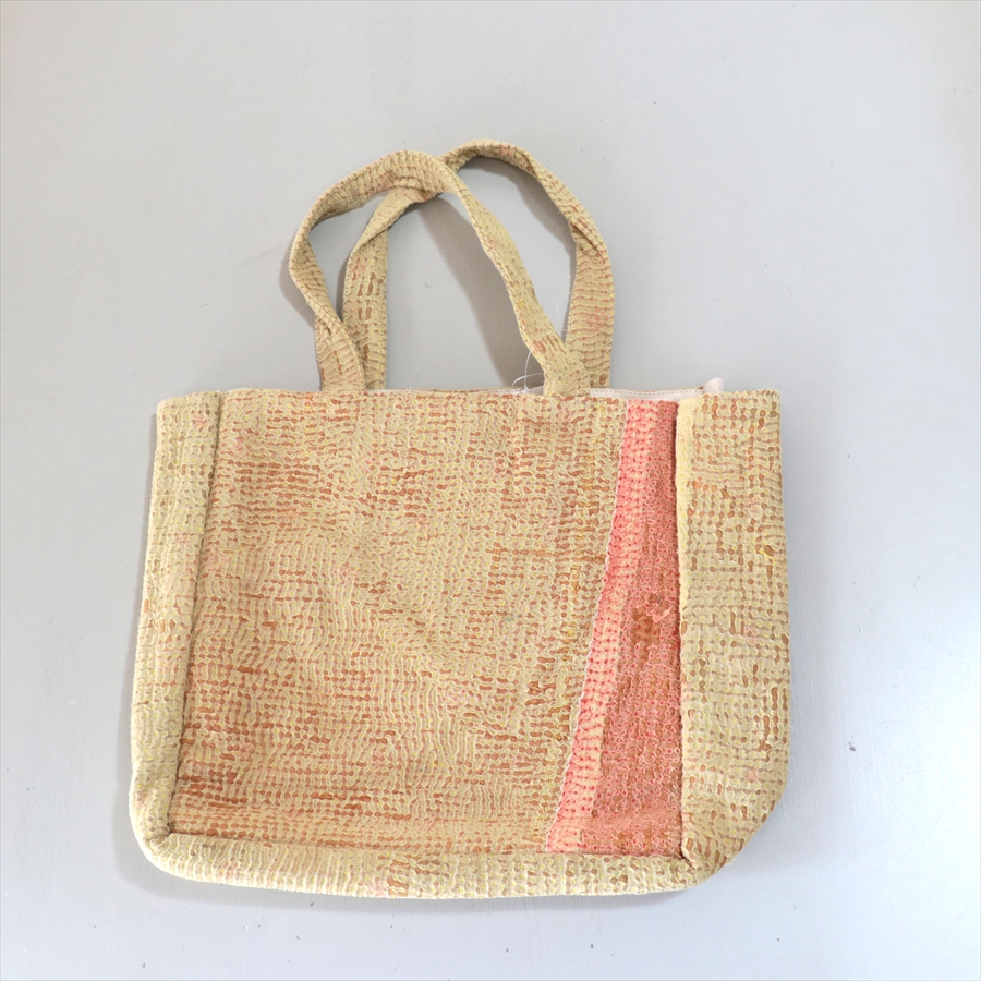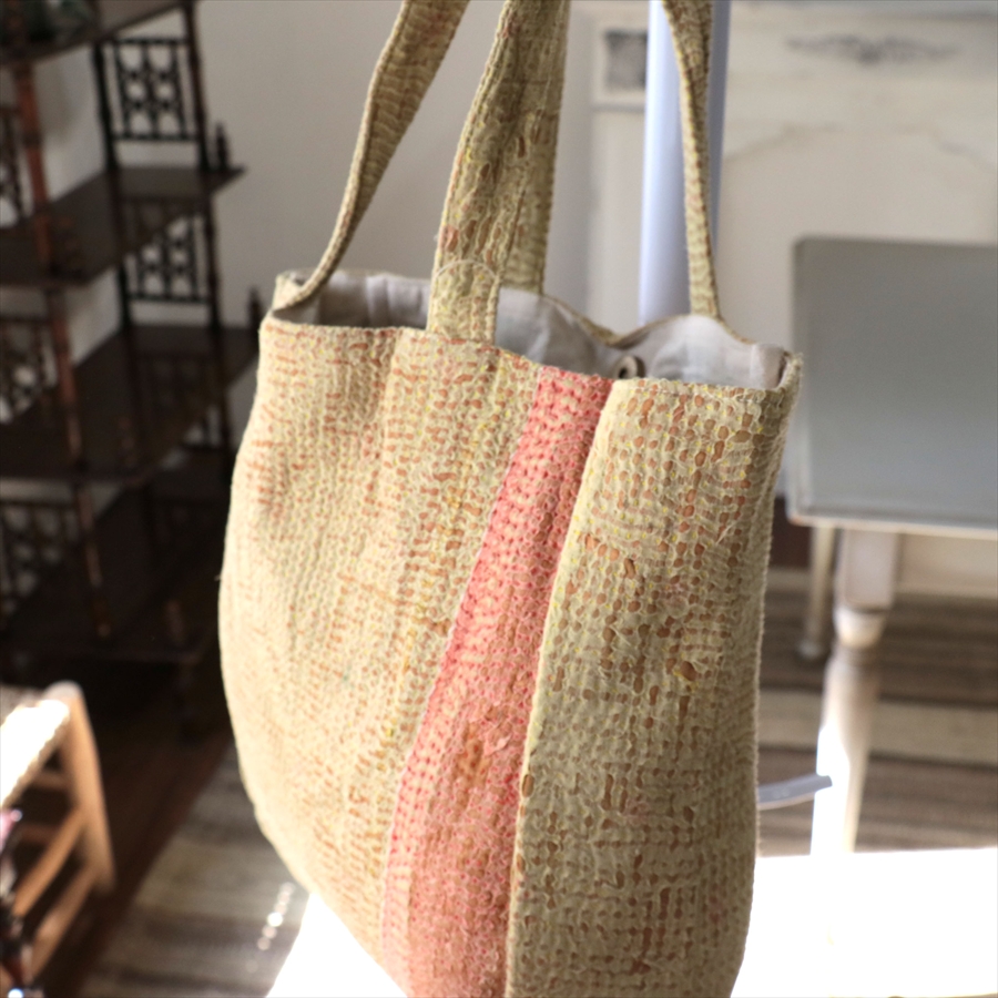 使い古された民族衣装のサリーやドゥパタを重ねて、刺し子刺繍をした伝統的な手仕事の布を使っています。表面のコットンは擦り切れているところもあるほど使い込まれていて、ヴィンテージ感たっぷり。コットンのやわらかな肌触りが心地よく、普段使いのバッグとして活躍してくれそうです。