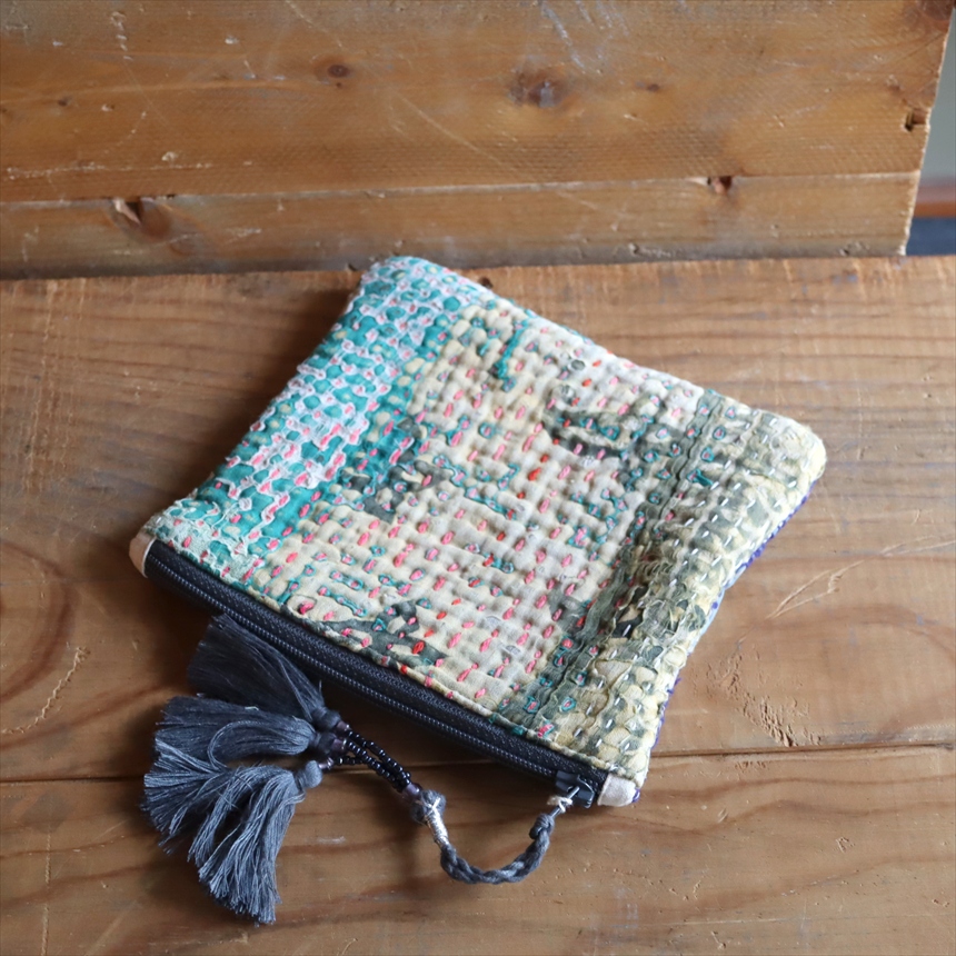 - ヴィンテージカンタ フラットポーチ カンタ刺繍 タッセル付きラリーキルト 現品 パープル系