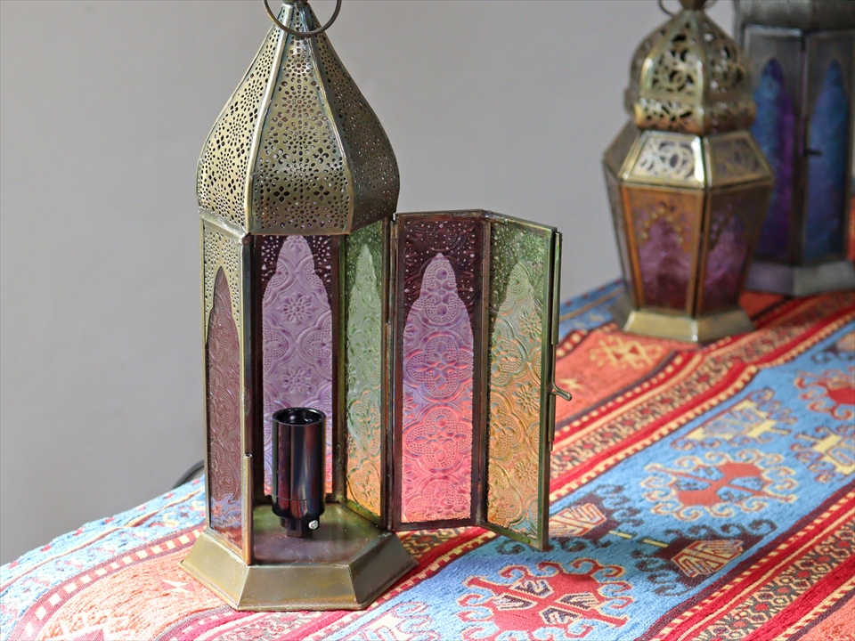 - モロッコランタン・テーブルランプ ミフラープデザイン リラ&グリーン 6面のレリーフガラス 電球ソケット・中間スイッチ付き