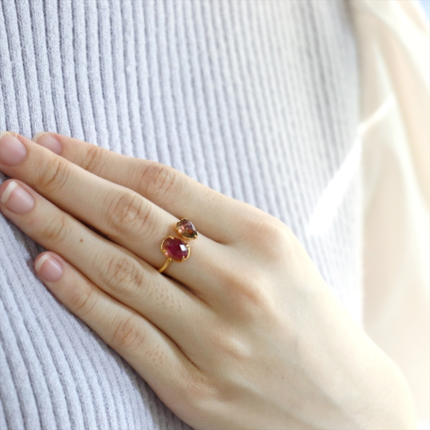トルマリン二粒リング 18KGF 天然石 バイカラーダブルストーン オープンリング