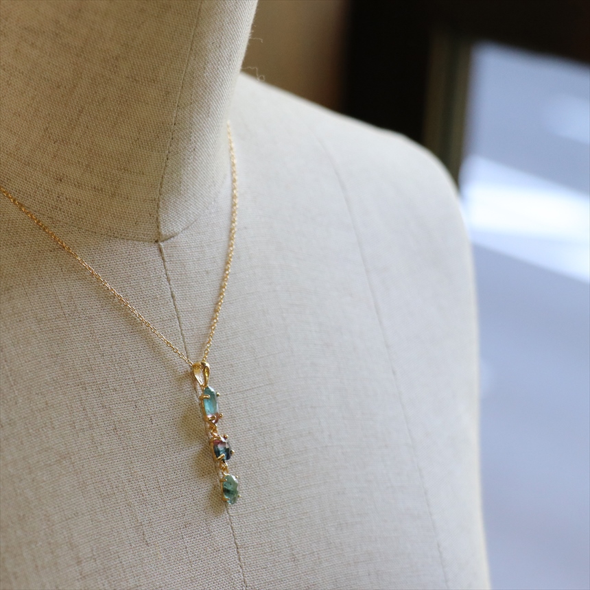 透明感あるブルーからピンクへのグラデーションの、ラフにカットされた石が三つ並んだウォーターメロントルマリンのネックレス。爪留めのデザインが上品な印象。ウォーターメロントルマリンとは、その名の通り、スイカのように外側がグリーンで、内側が赤いピンクの配色からなるバイカラートルマリンのことをいいます。大きさ違いの石が寄り添うようなフォークリングデザインは手元を華奢にみせてくれます。※石上1×0.6cm