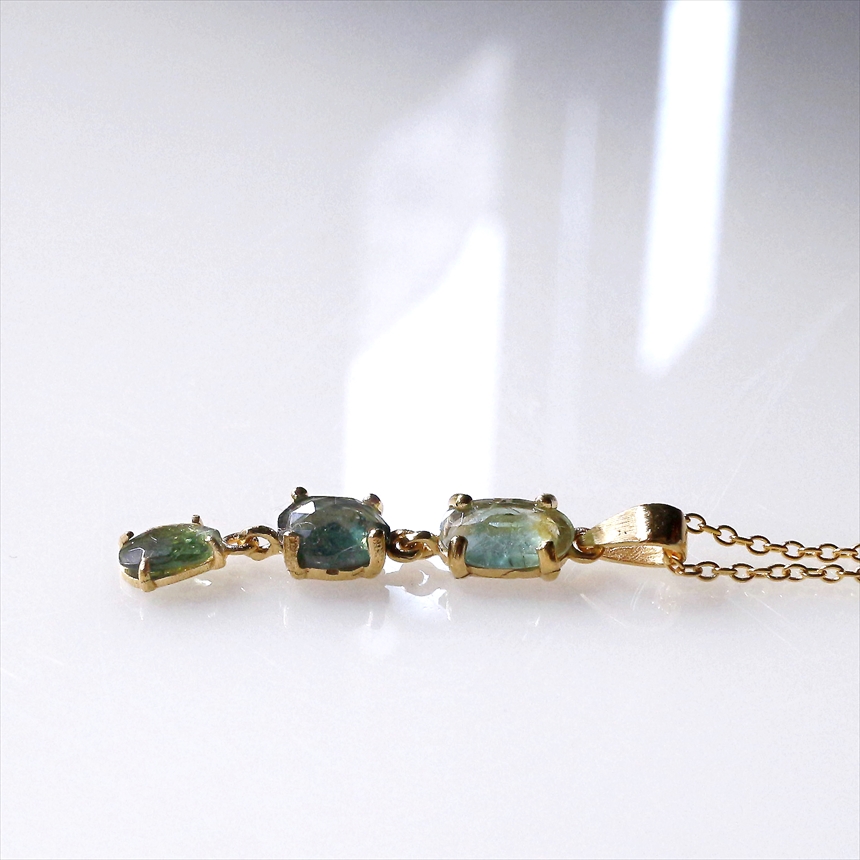 透明感あるブルーからグリーンのグラデーションの、ラフにカットされた石が三つ並んだウォーターメロントルマリンのネックレス。爪留めのデザインが上品な印象。ウォーターメロントルマリンとは、その名の通り、スイカのように外側がグリーンで、内側が赤いピンクの配色からなるバイカラートルマリンのことをいいます。大きさ違いの石が寄り添うようなフォークリングデザインは手元を華奢にみせてくれます。※石上1×0.6cm