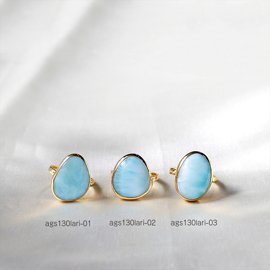 ラリマー特有の乳白色が混ざったブルーに、波模様が見えるリングです。丸みを帯びたオーバルのフォルムが、手元に穏やかで上品な印象を与えます。
