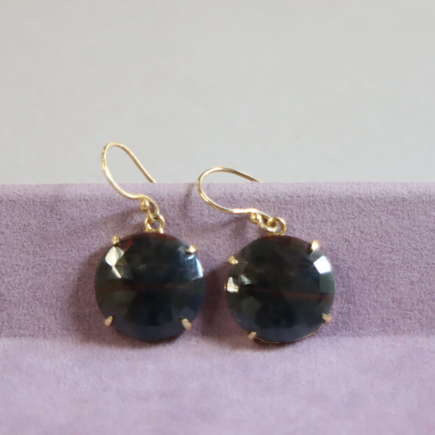 ほんのりグリーンがかったくすんだ淡いブルーが大変美しいサファイアシルバーピアス。真ん丸の形が優しい印象です。丁寧にローズカットが施されているので、耳元で揺れ輝きます。