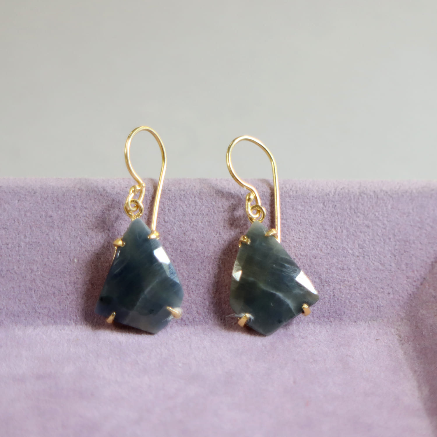 淡いカーキがかったくすんだブルーグレーの色合いが美しいサファイアシルバーピアス。丁寧にローズカットが施されているので、耳元で揺れ輝きます。