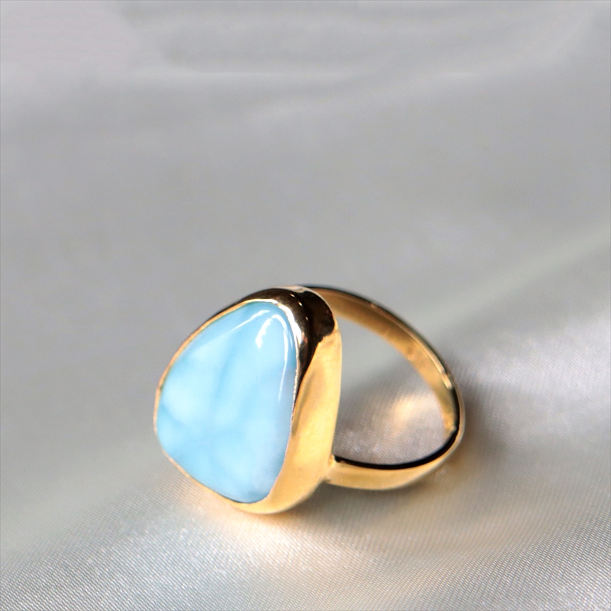 ラリマー特有の乳白色が混ざったブルーに、波模様が見えるリングです。丸みを帯びた、柔らかな三角形。この有機的なラインが、ラリマーの優しいブルーと相まって、手元に穏やかで上品な印象を与えます。