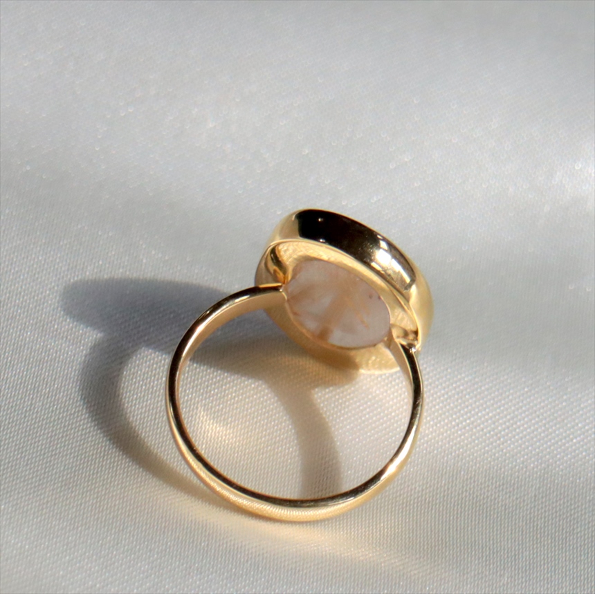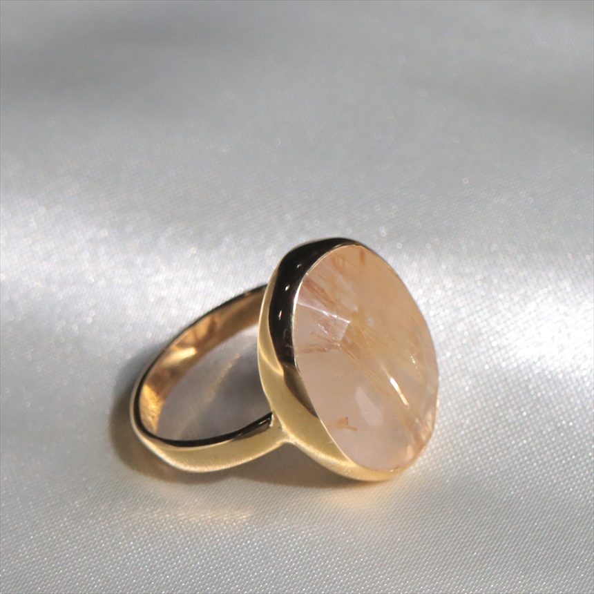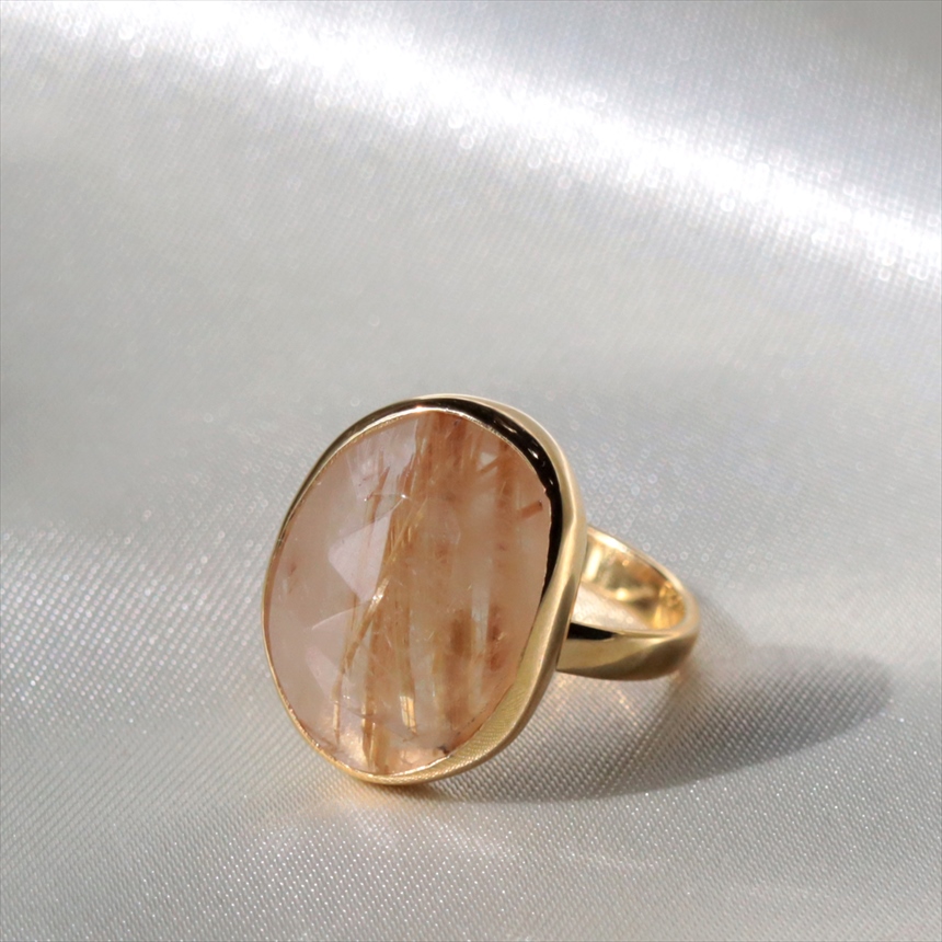 クリアなクォーツの中に繊細なゴールドの針(ルチル)が閉じ込められた、自然が生んだ神秘ともいえる、ルチルクォーツのリングです。肌に溶け込むヌーディーな色調にゴールドが煌めき、手元をより洗練された知的な印象にみせてくれます。