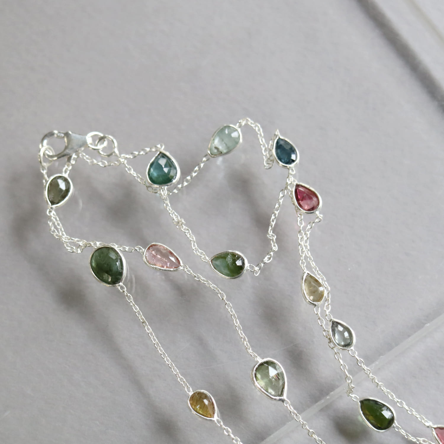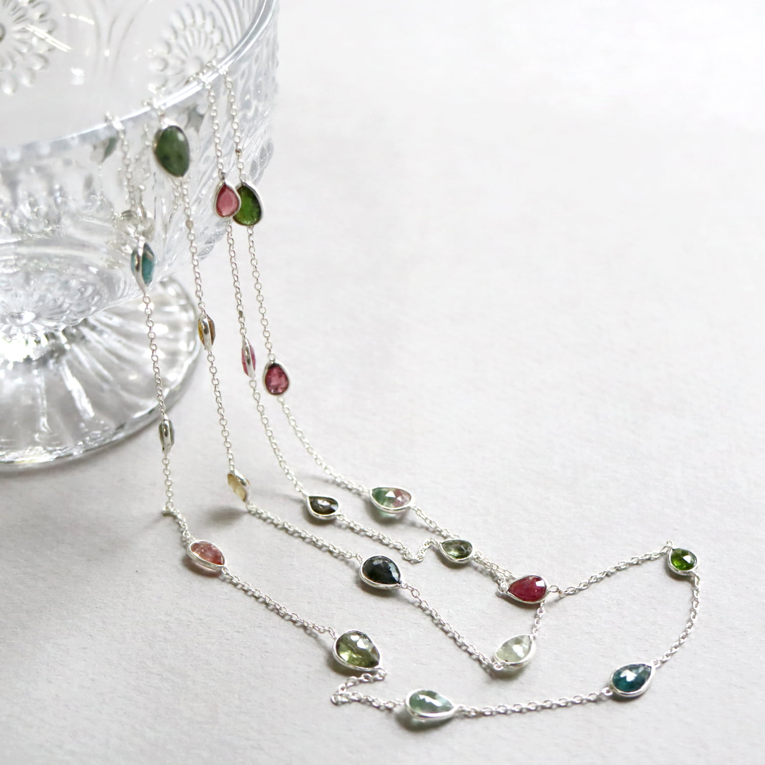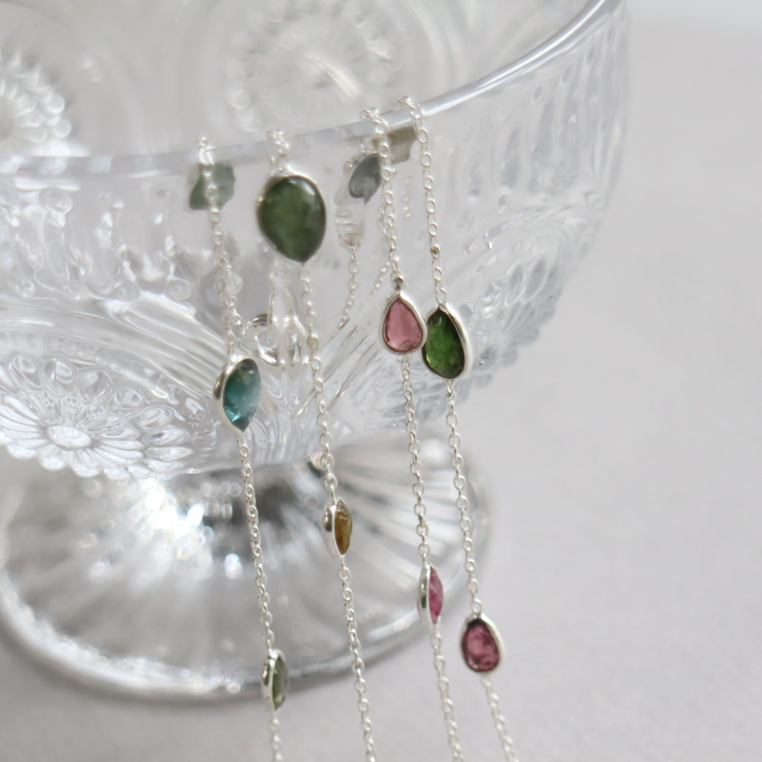 ドロップ型の小さなトルマリンをつないだシルバーネックレス。1㎜のシルバーチェーンでつながれて軽い着け心地です。チェーンはカニカン付きで、2重にしてもお使いいただけます。