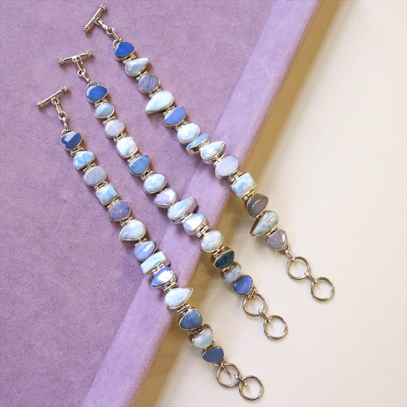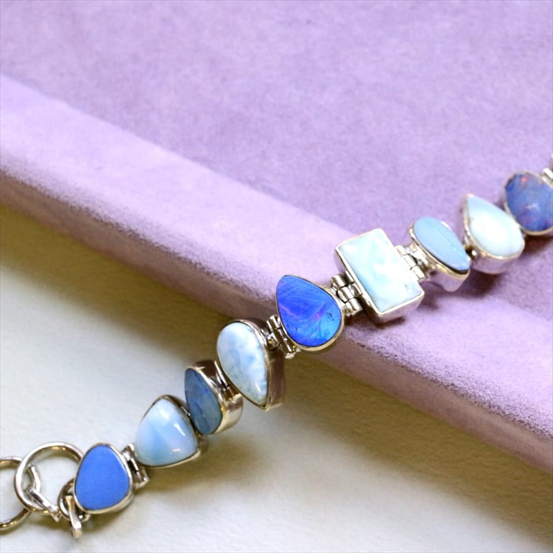 ブレスレットに仕立てられてあるものをインド・ジャイプールの工房から買い付けています。オパールの色は白から水色、やや紫がかったものもあり、それぞれに遊色効果が見られます。※写真の現品をお届けします。オパール7粒、ラリマー6粒。