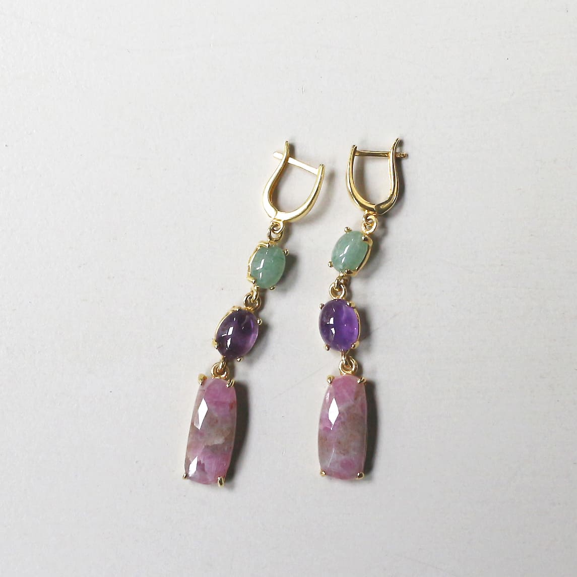 - ナチュラルサファイア×アメシスト×グリーンアベンチュリン 18KGF 天然石 シルバーピアス くすみカラー