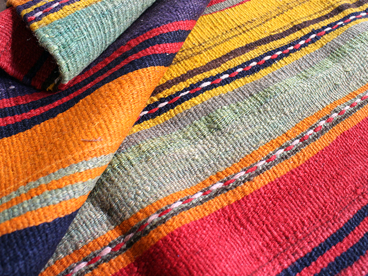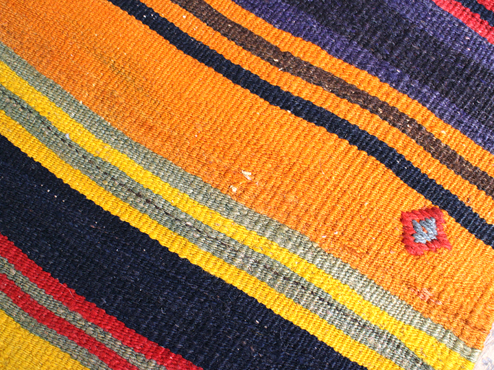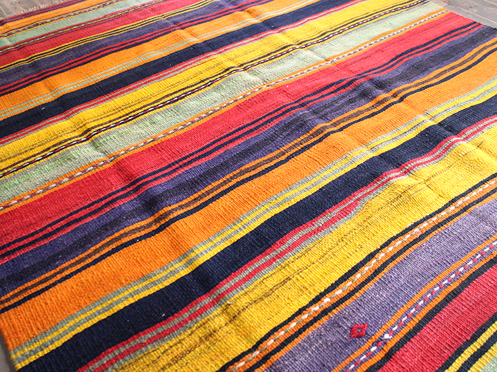 シンプルなボーダーキリムです。あまり日焼けしておらず、全体に色が濃くのこっていてきれいな状態です。