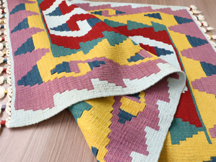織り地がしなやかでやわらかいのがカイセリキリムの特徴です。やや厚みがあり、やさしい肌触り。色の切り替え部分には、キリムの織りの特徴で、縦に隙間が開いています(スリットと呼んでいます)。