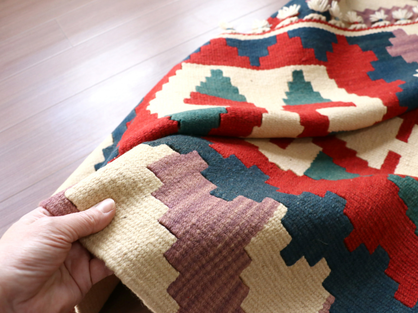 織り地がしなやかでやわらかいのがカイセリキリムの特徴です。やや厚みがあり、やさしい肌触り。色の切り替え部分には、キリムの織りの特徴で、縦に隙間が開いています(スリットと呼んでいます)。