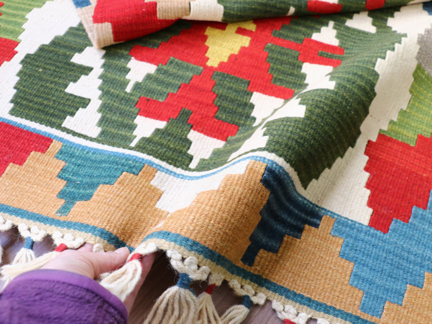 織り地がしなやかでやわらかいのがカイセリキリムの特徴です。やや厚みがあり、やさしい肌触り。色の切り替え部分には、キリムの織りの特徴で、縦に隙間が開いています(スリットと呼んでいます)。