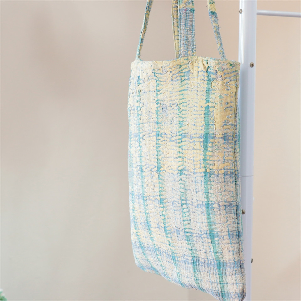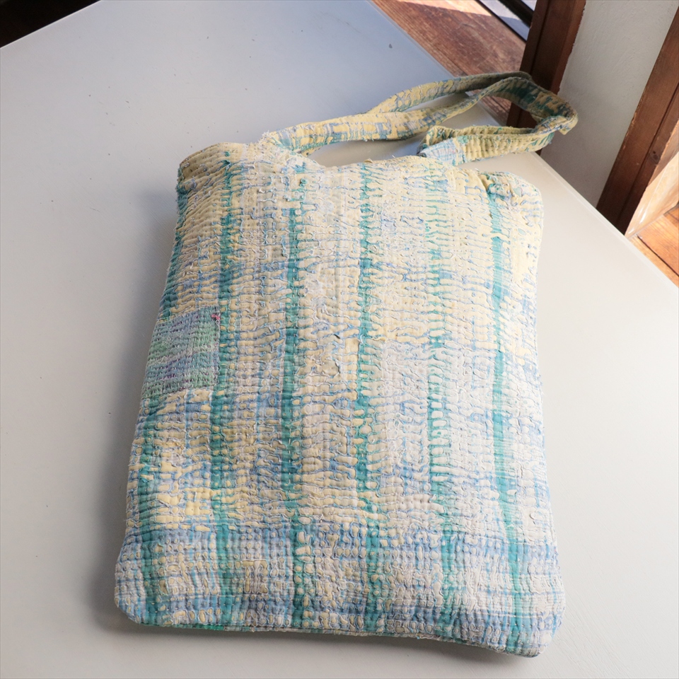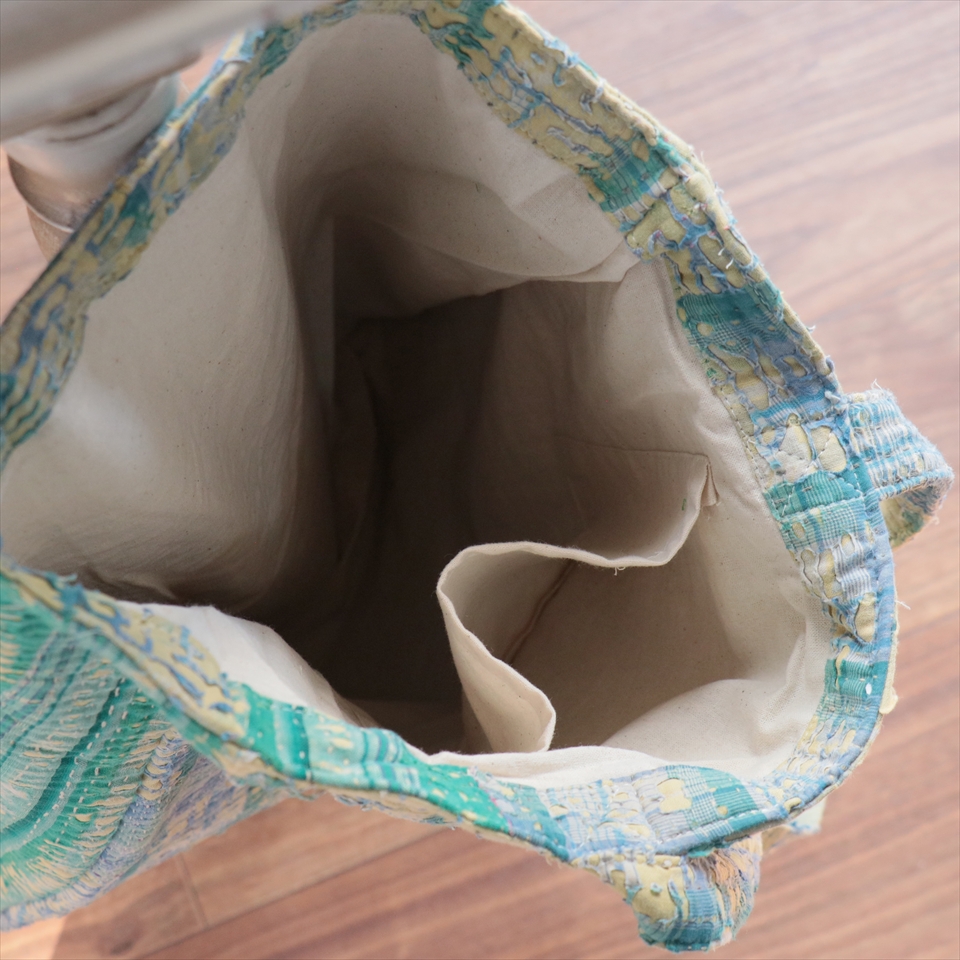 使い古された民族衣装のサリーやドゥパタを重ねて、刺し子刺繍をした伝統的な手仕事の布を使っています。表面のコットンは擦り切れているところもあるほど使い込まれていて、ヴィンテージ感たっぷり。コットンのやわらかな肌触りが心地よく、普段使いのバッグとして活躍してくれそうです。