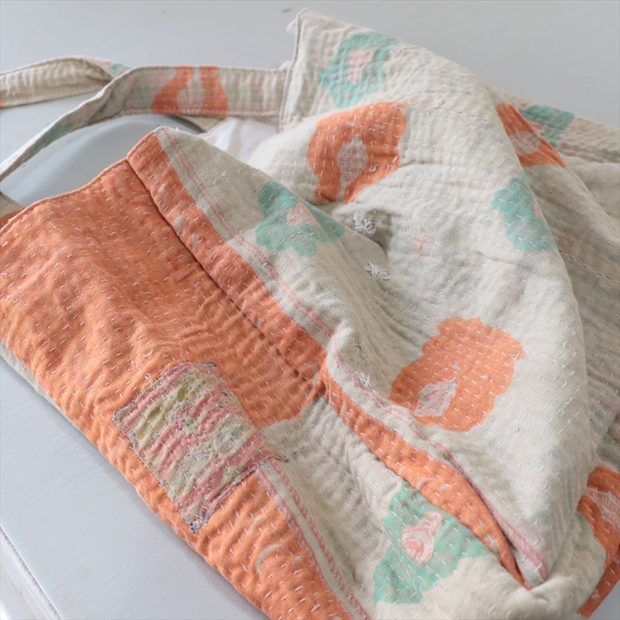 使い古された民族衣装のサリーやドゥパタを重ねて、刺し子刺繍をした伝統的な手仕事の布を使っています。表面のコットンは擦り切れているところもあるほど使い込まれていて、ヴィンテージ感たっぷり。コットンのやわらかな肌触りが心地よく、普段使いのバッグとして活躍してくれそうです。