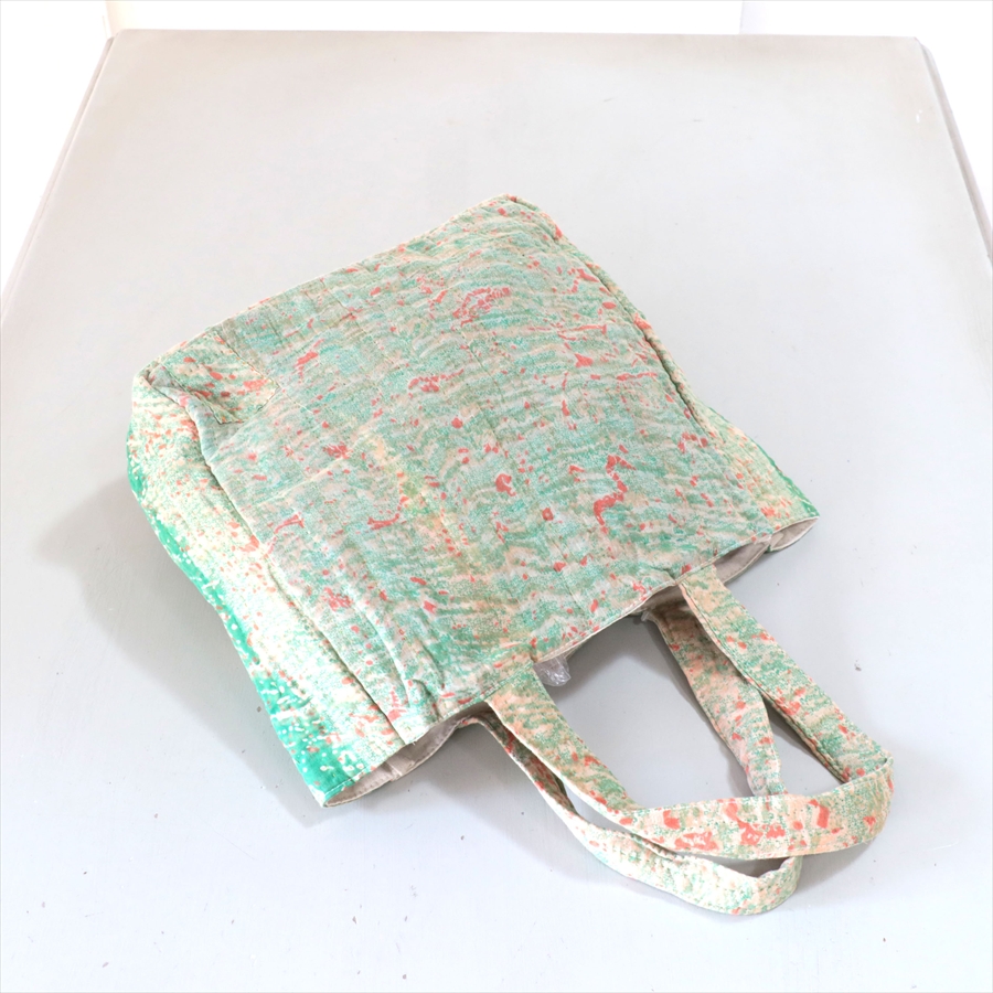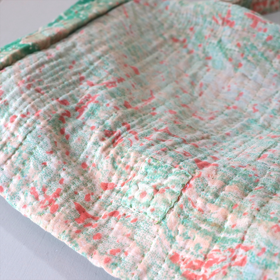 使い古された民族衣装のサリーやドゥパタを重ねて、刺し子刺繍をした伝統的な手仕事の布を使っています。表面のコットンは擦り切れているところもあるほど使い込まれていて、ヴィンテージ感たっぷり。コットンのやわらかな肌触りが心地よく、普段使いのバッグとして活躍してくれそうです。